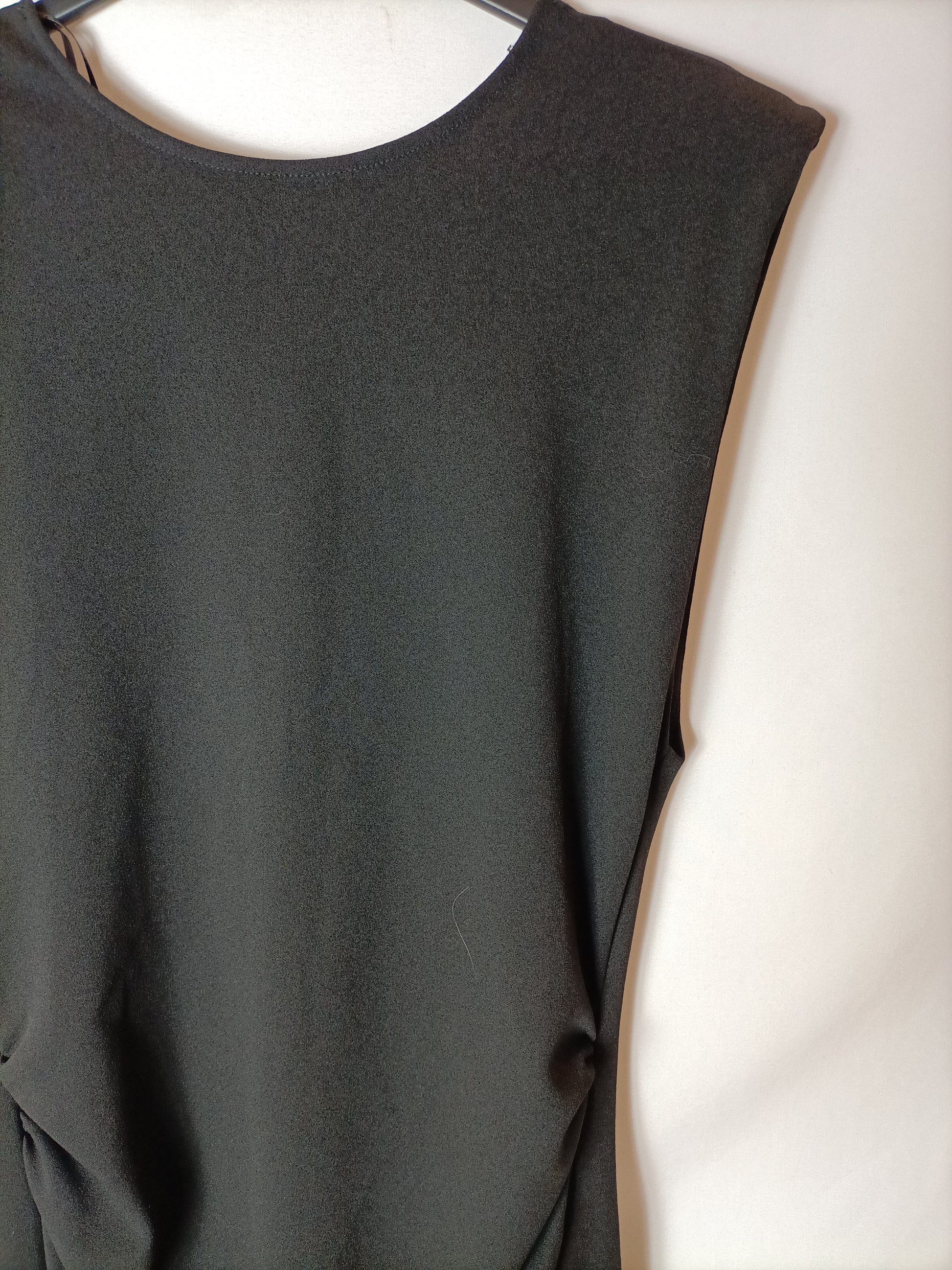 NUEVO CON ETIQUETA. Vestido midi negro con hombreras. Tejido semi elástico