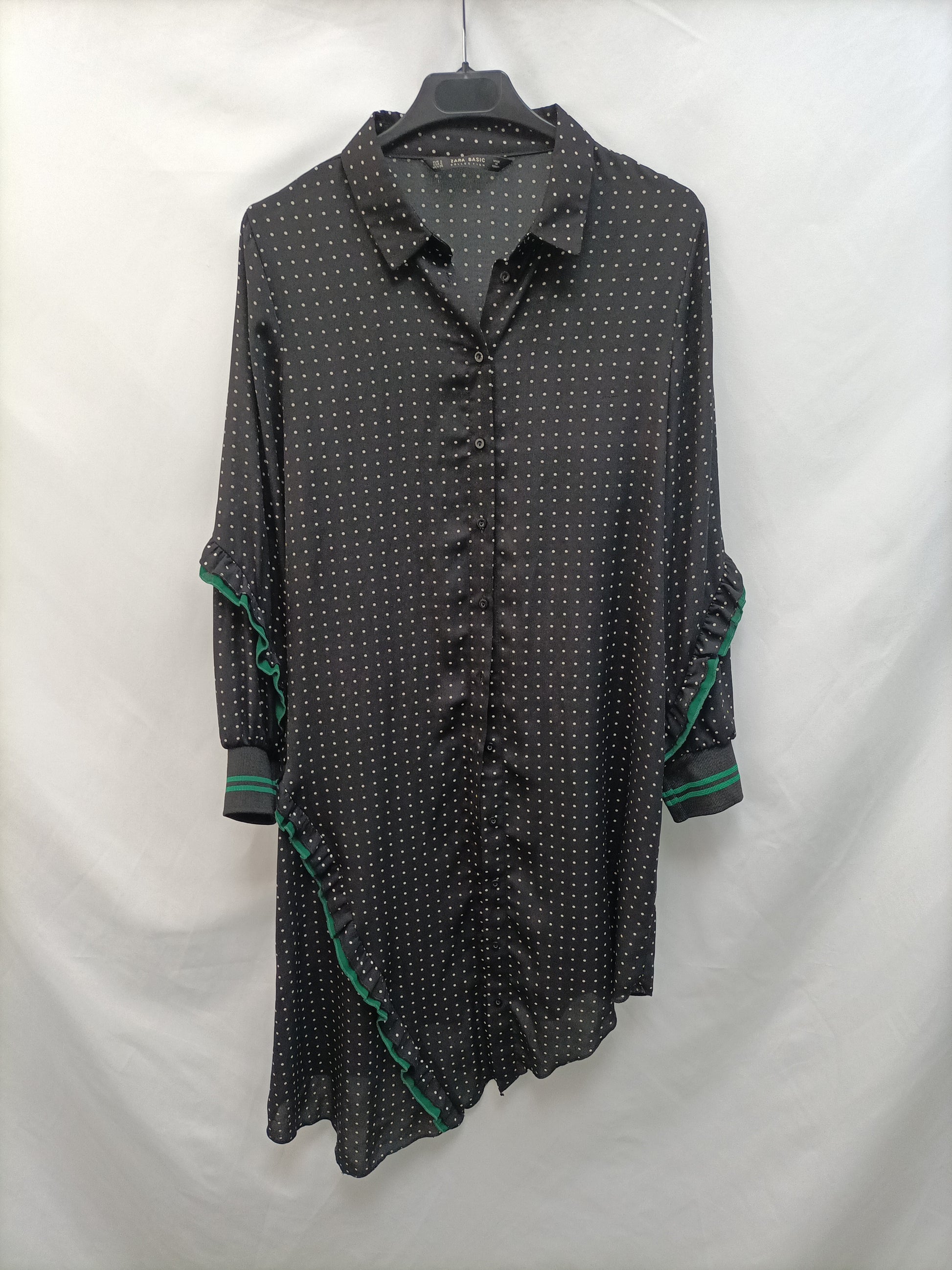 Zara. Vestido negro con lunares blancos y detalle de volantes con rayas verdes. Fluido y finito. Bajo asimétrico. No elástico. De sisa a sisa 48 cm largo 92 cm