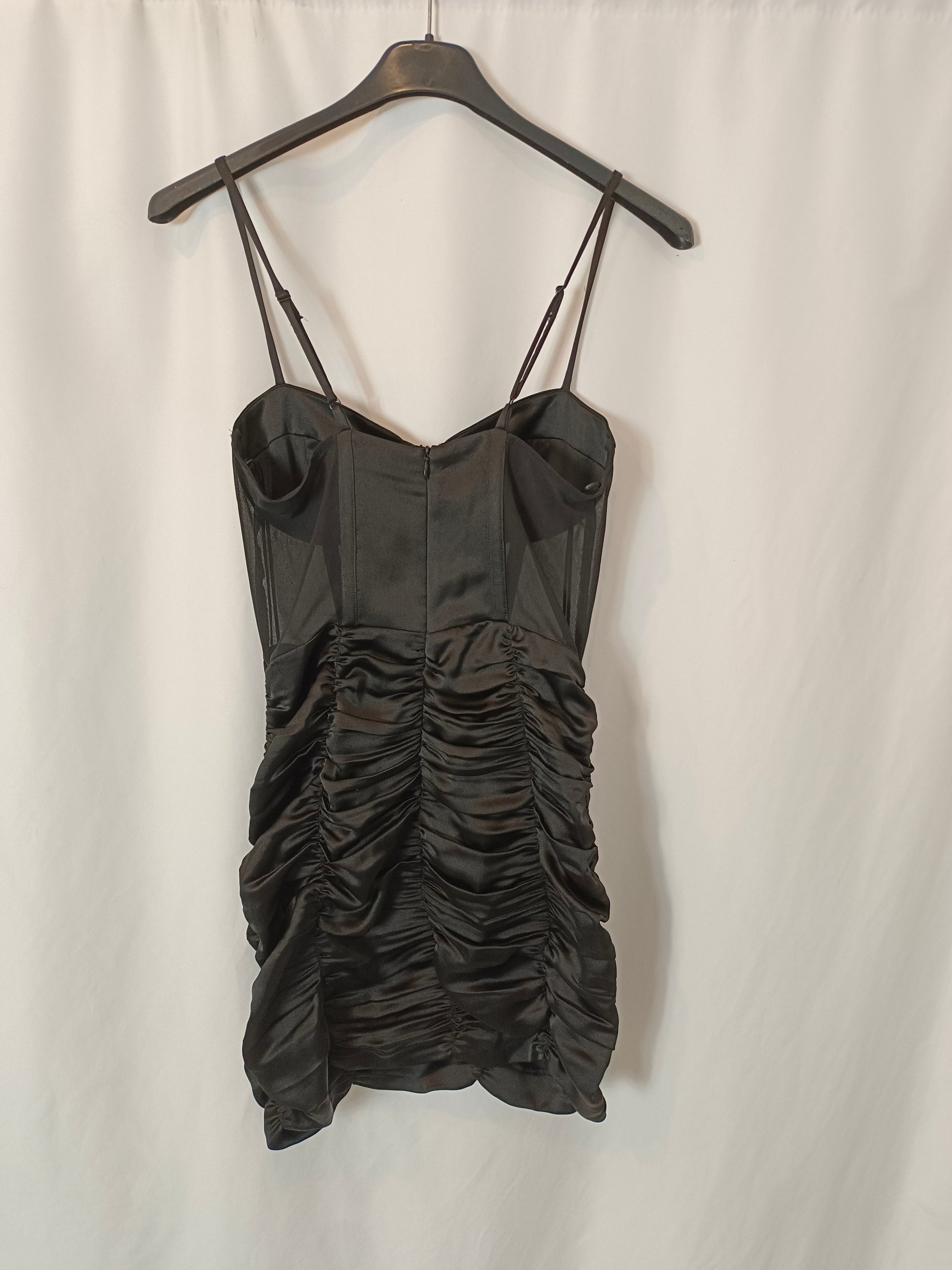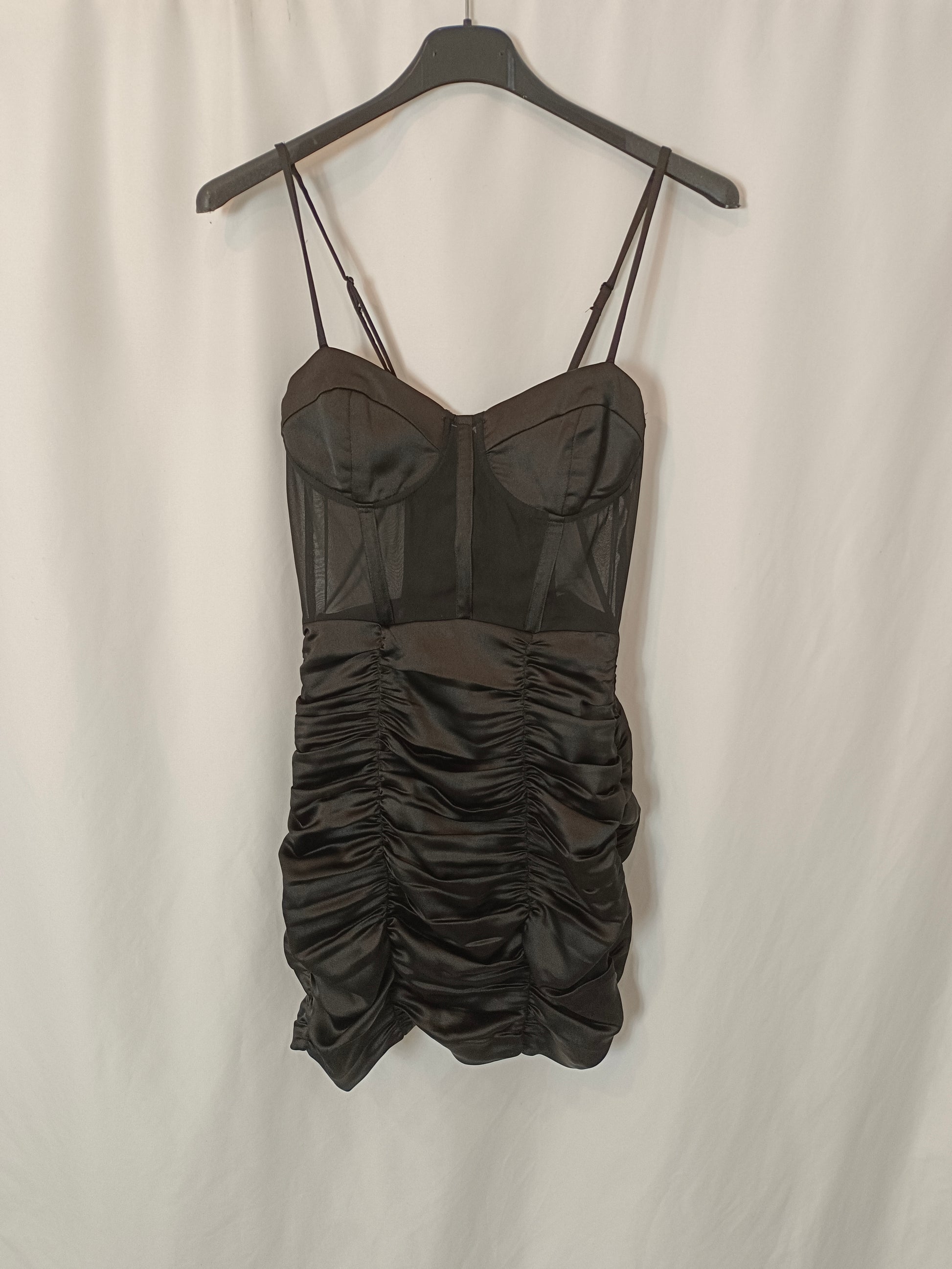 vestido corto negro con la parte de la falda fruncida y satinada. Detalles semitransparente. Espalda 36 cm largo 80 cm