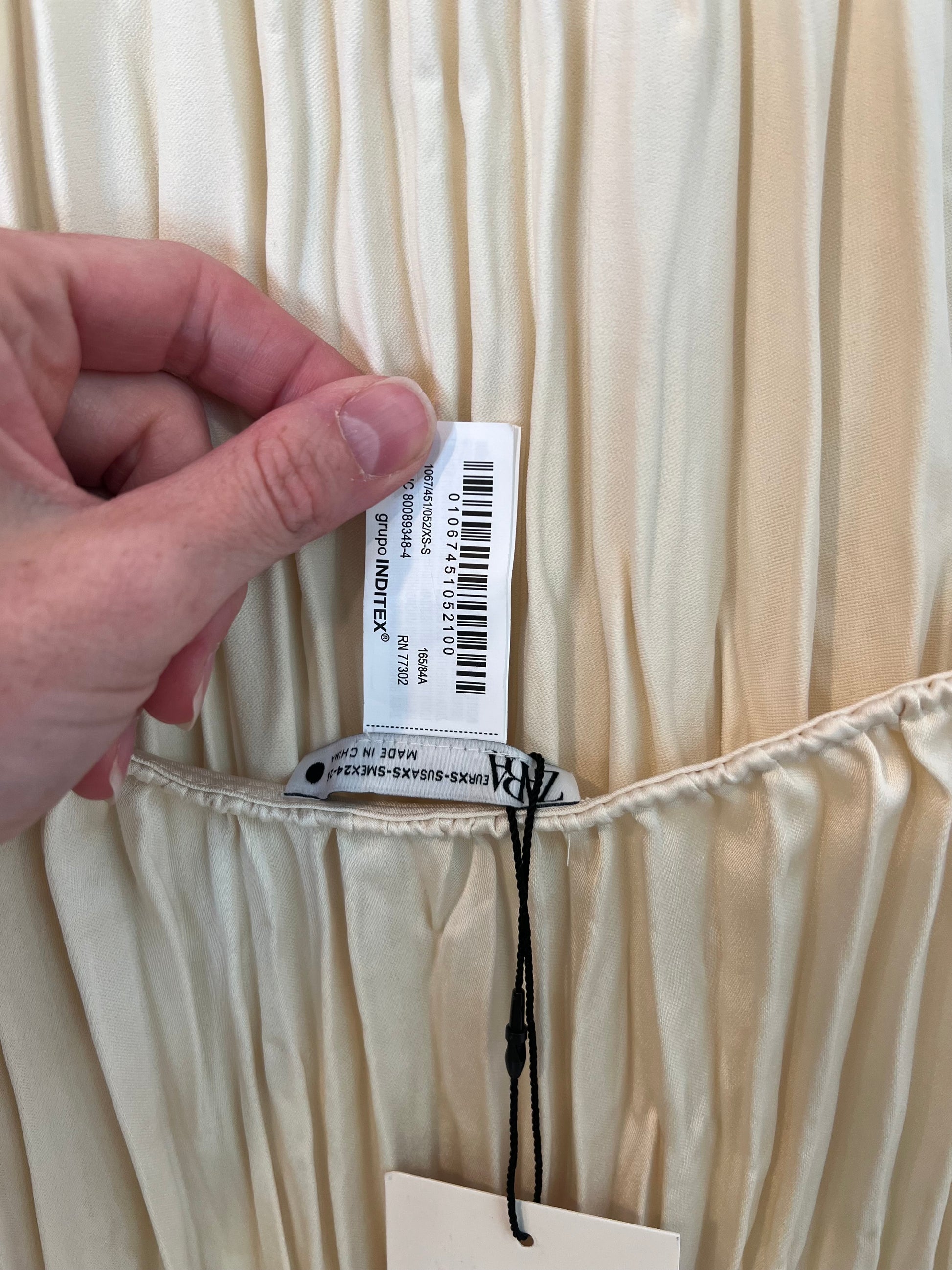 NUEVO CON ETIQUETA. Vestido largo plisado beige espalda al aire