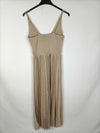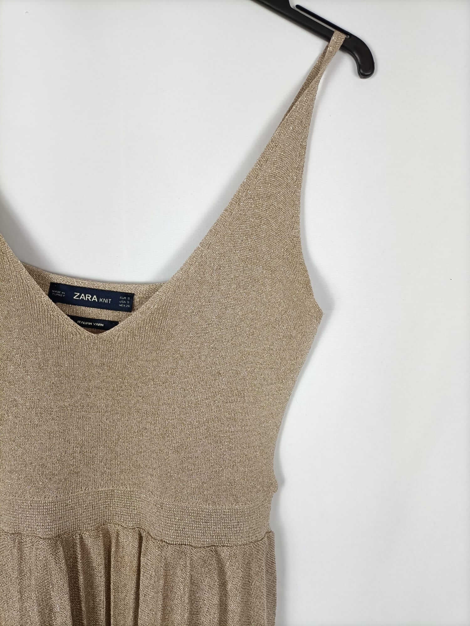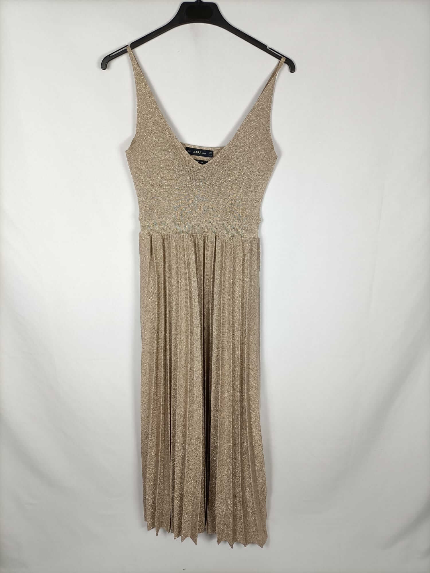 Zara. Vestido beige con hilos dorados. Elástico con la falda plisada con movimiento. Largo 128 cm