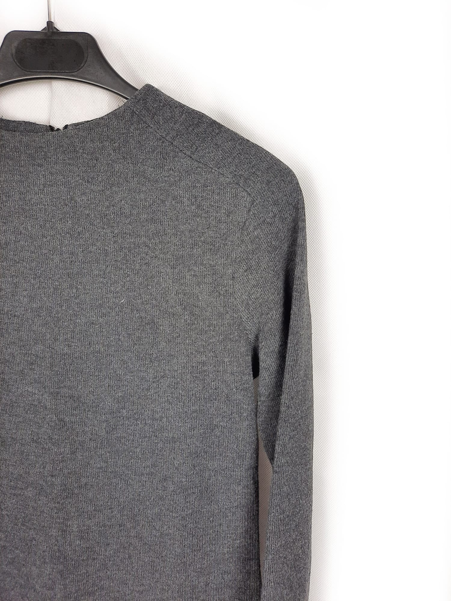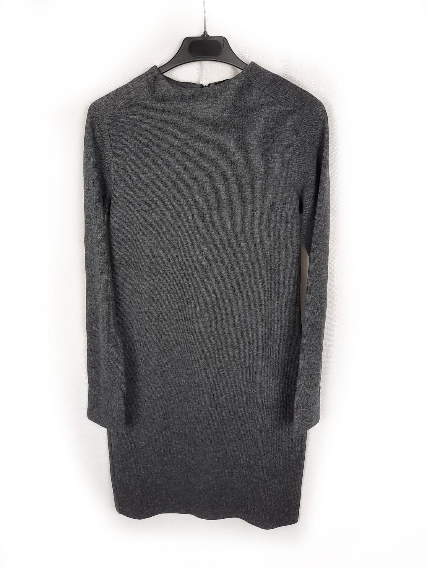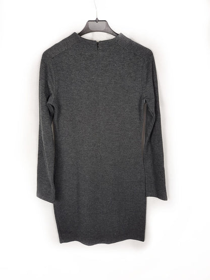 Vestido de punto gris con el cuello un poco alto. Es elástico y se abrocha con cremallera trasera. Largo 87 cm