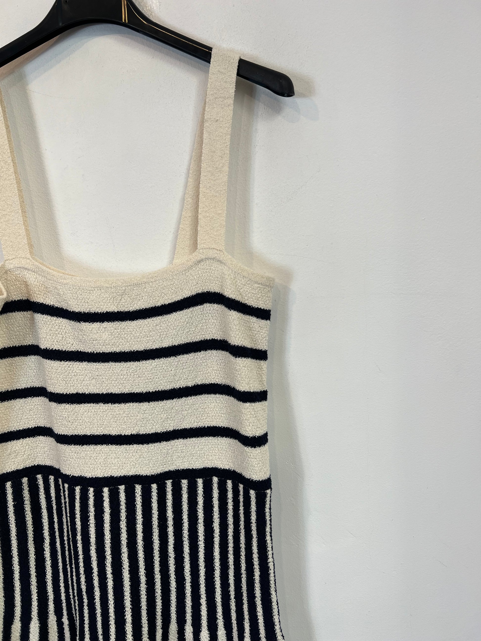 vestido largo de rayas azul y beige con textura. Elástico. largo 143 cm.