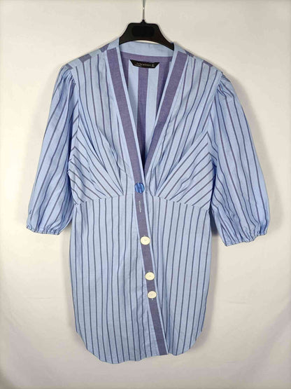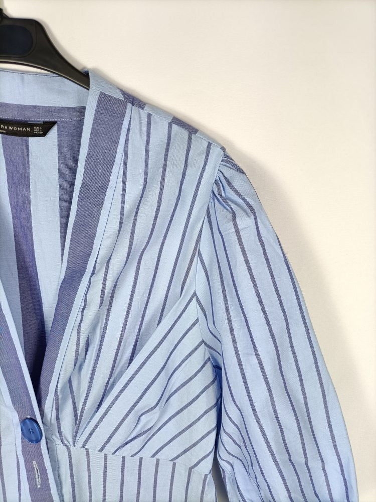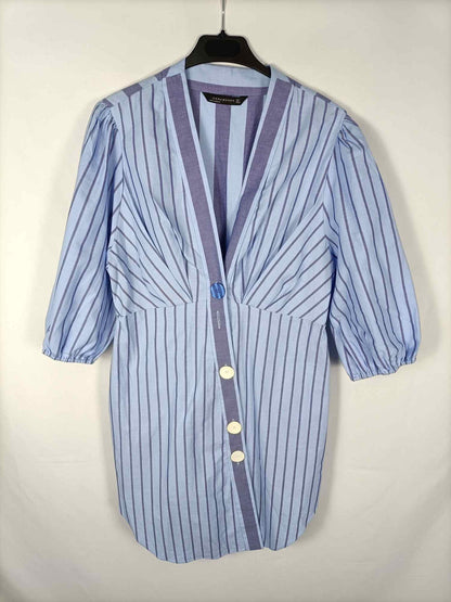 Zara. L. Vestido de rayas en tonos azules con botones en diagonal. Mangas 3/4 abullonadas. No elástico. De sisa a sisa 47 cm largo 96 cm. Tara: le falta un botón