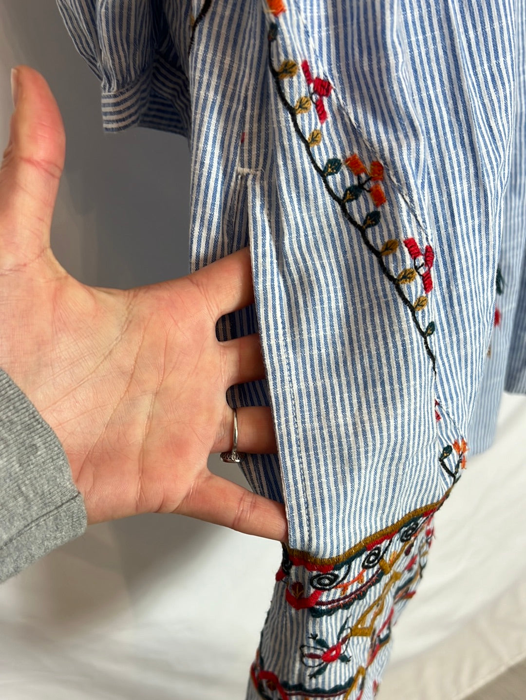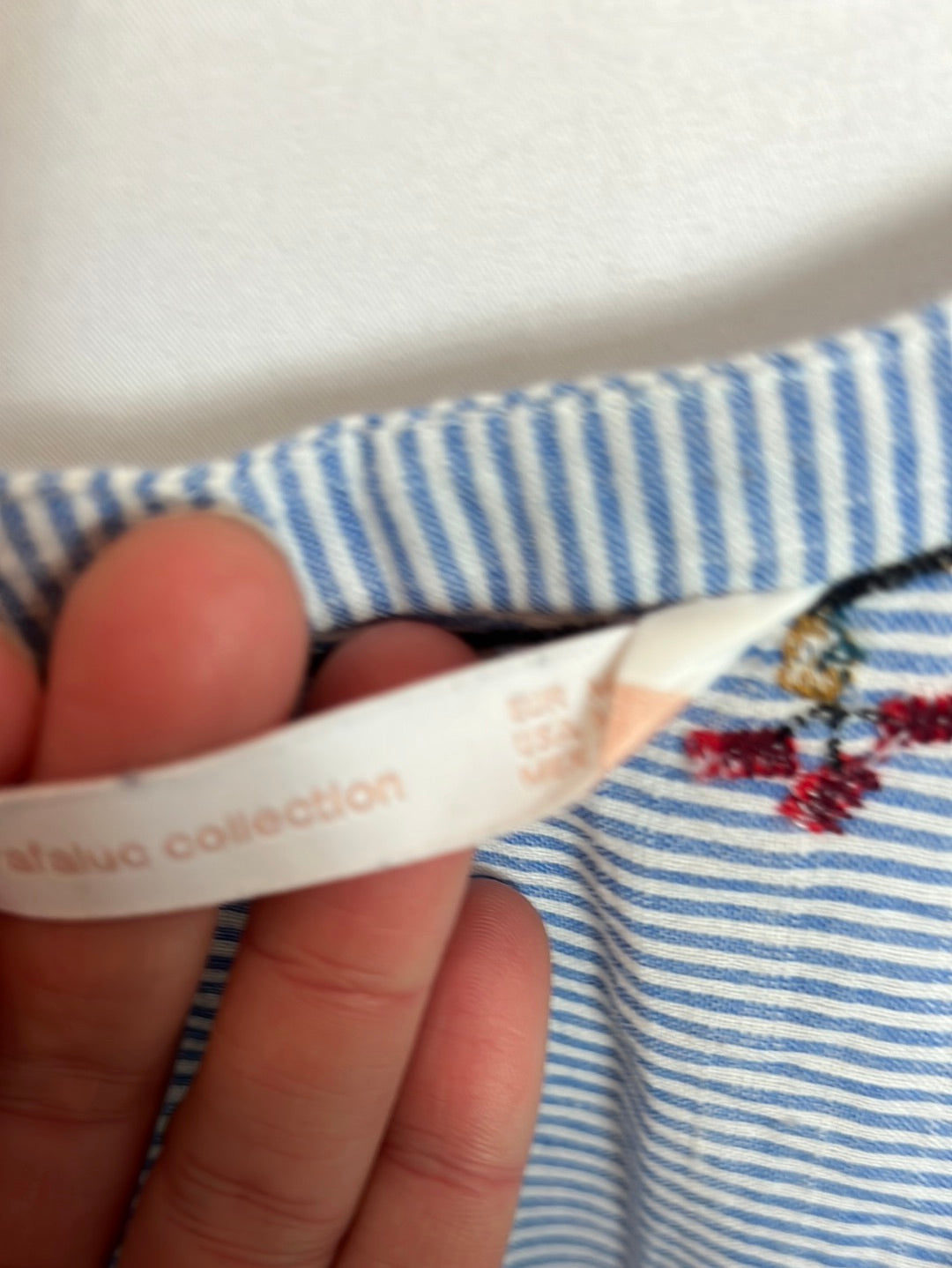 Vestido corto rayas azules y bordados colores.largo 83cm