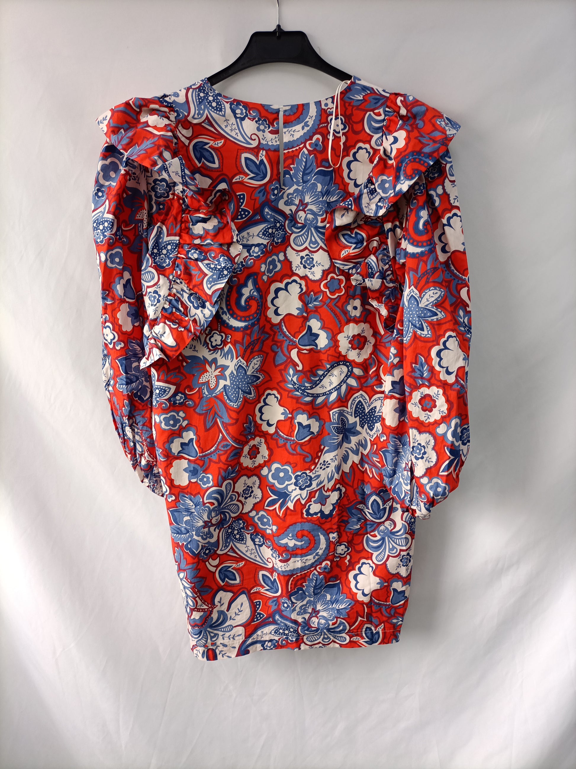 Vestido corto rojo con flores en azul. Volantes en los hombros y mangas Abullonadas. De sisa a sisa 48 cm largo 80 cm