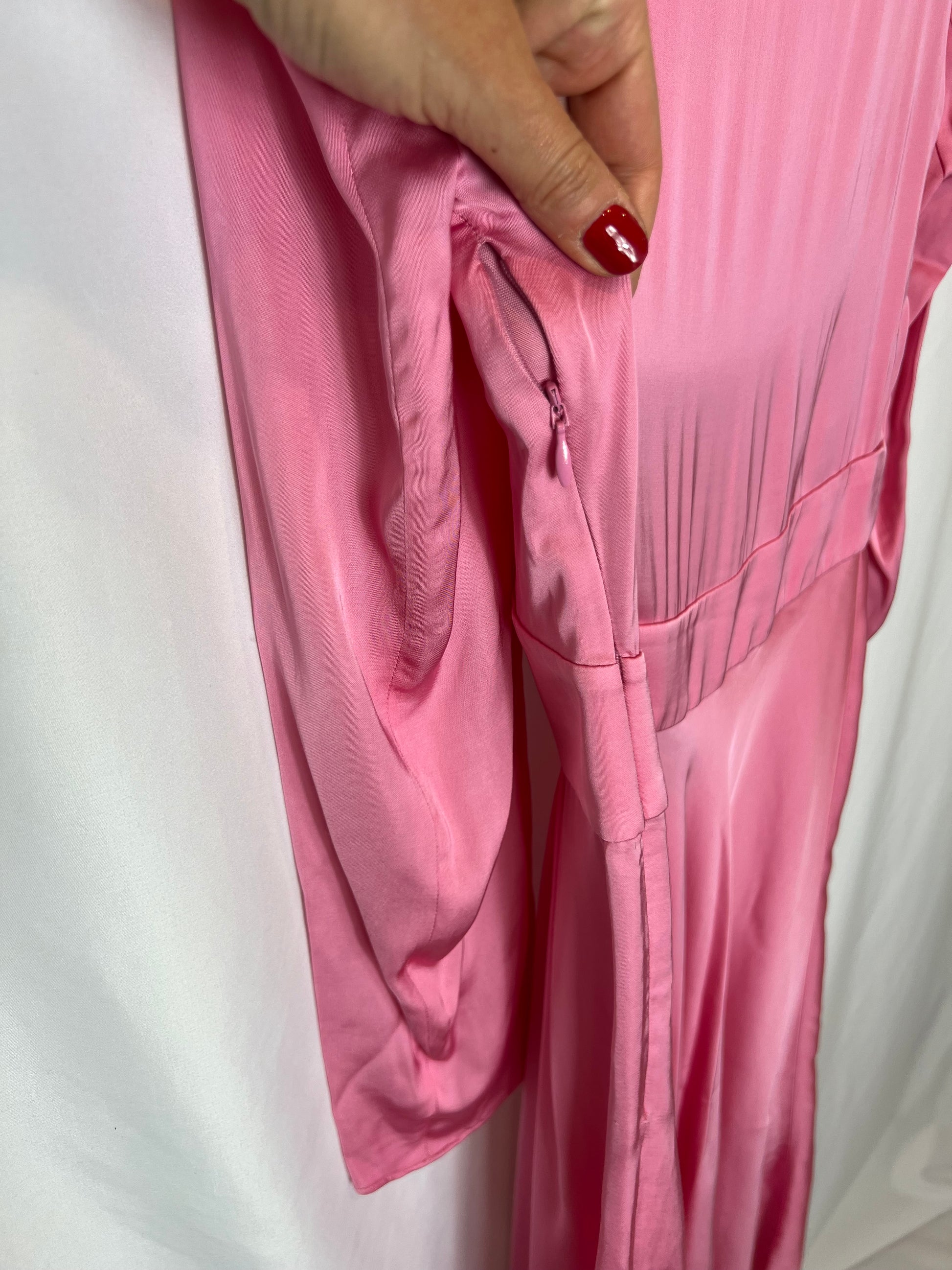 NUEVO CON ETIQUETA. Vestido midi rosa con detalle de cuello perkins con botones joya. Cibtura 37cm, largo 133cm