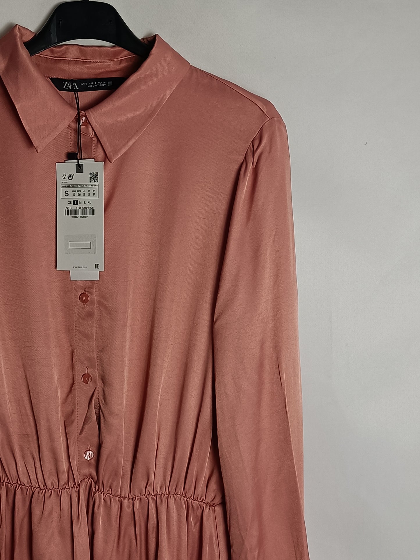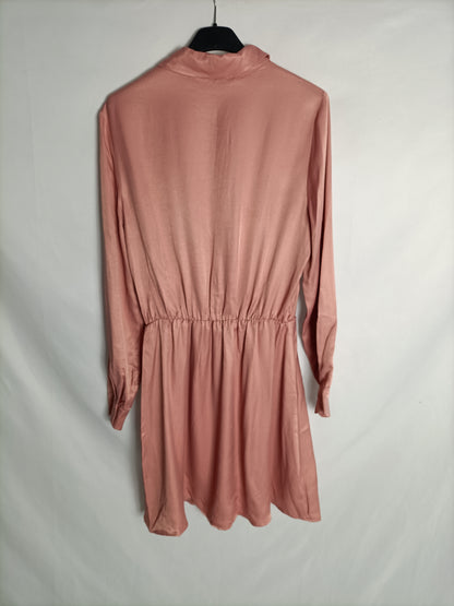 ZARA. Vestido rosa corto abotonado satinado. T S
