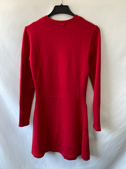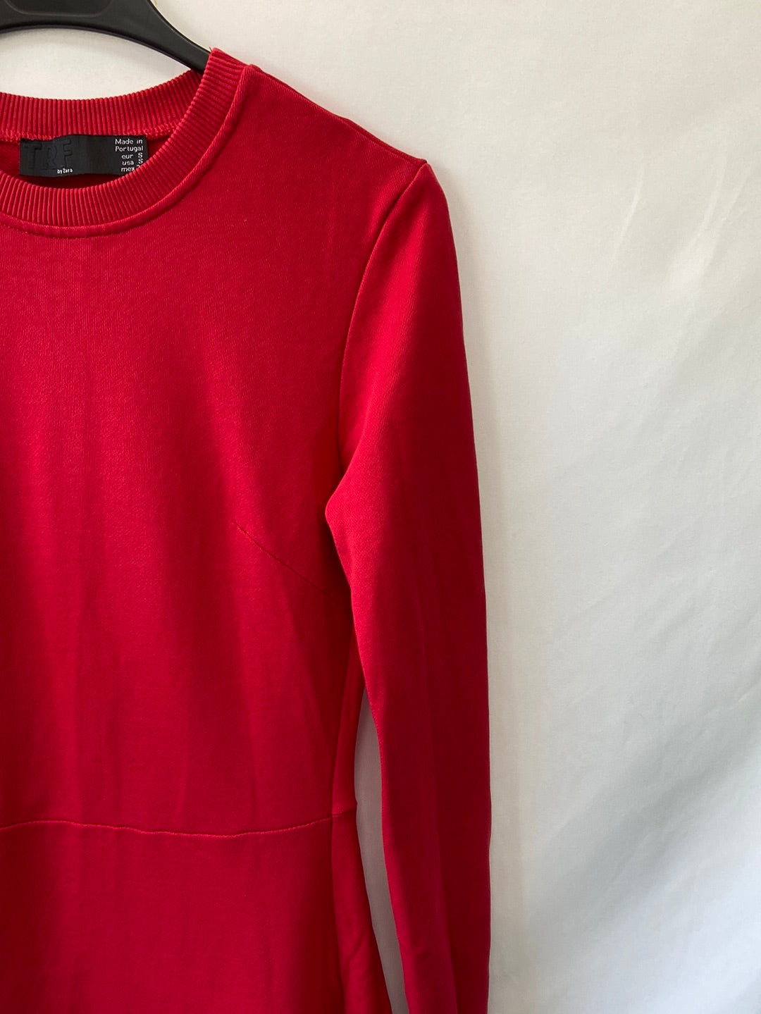 Vestido rojo con falda de vuelo y tejido de sudadera.