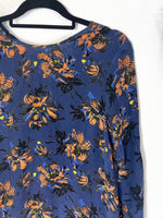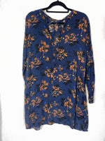 Vestido azul con flores en tonos color ocre, es fino y fluido. largo 86 cm