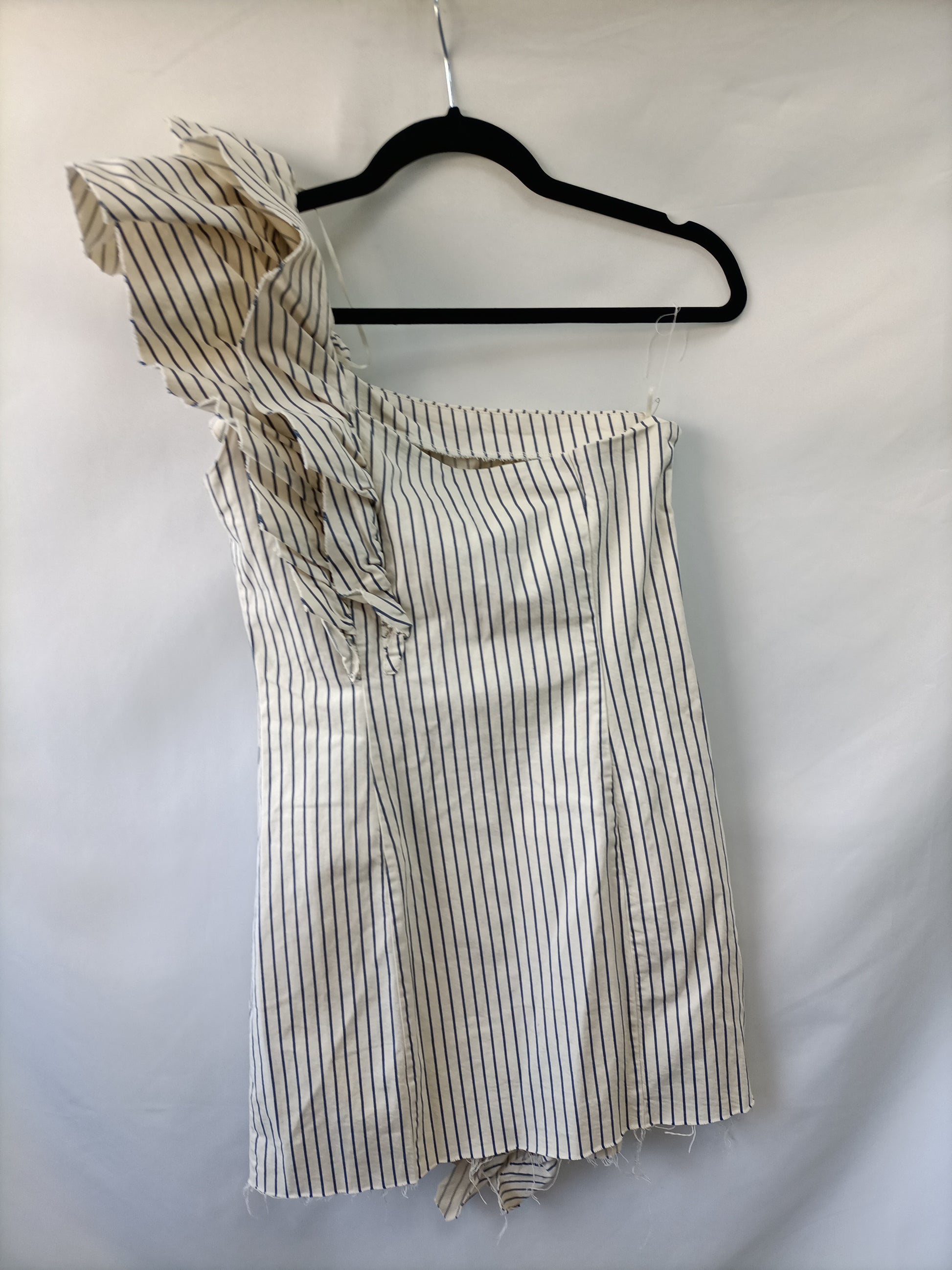Vestido blanco de rayas azules marinas. Una manga con volante cruzado. Cremallera lateral. Tela tipo vaquera fina. Extremos deshilachados. de sisa a sisa 43 cm, cintura 40 cm, largo 77 cm