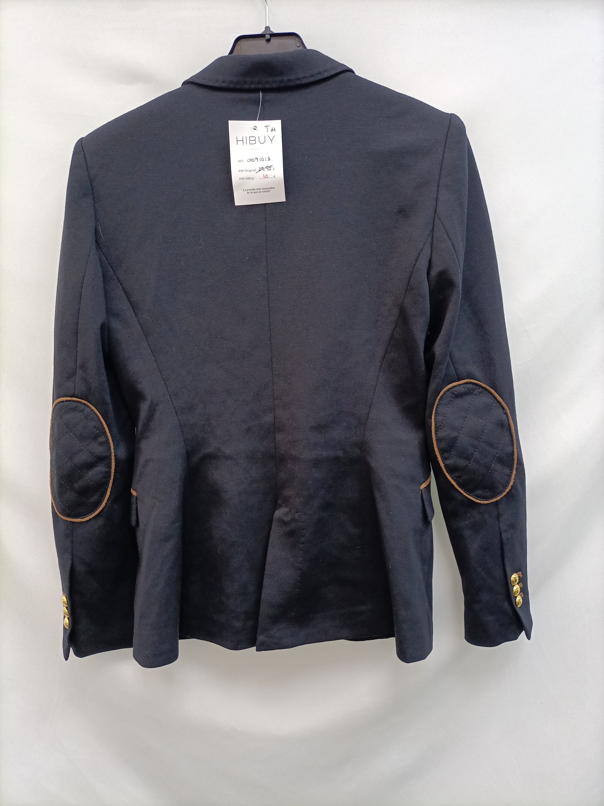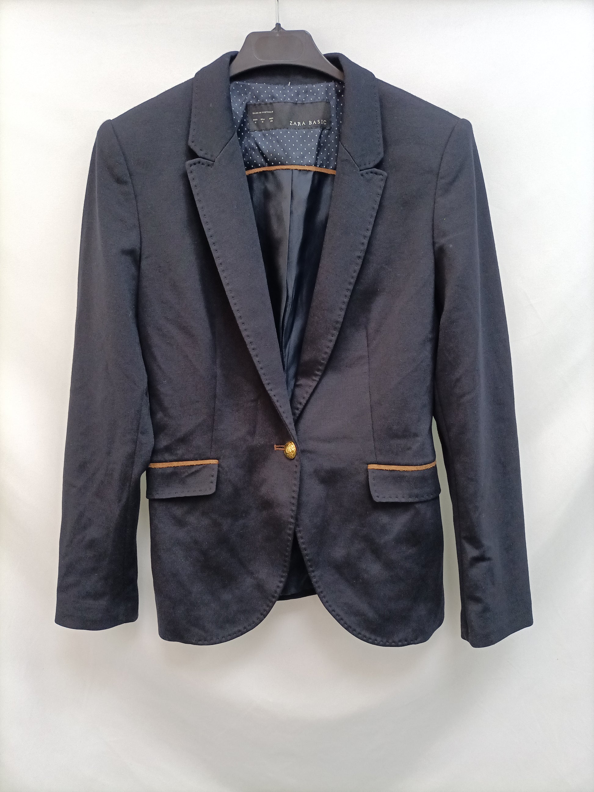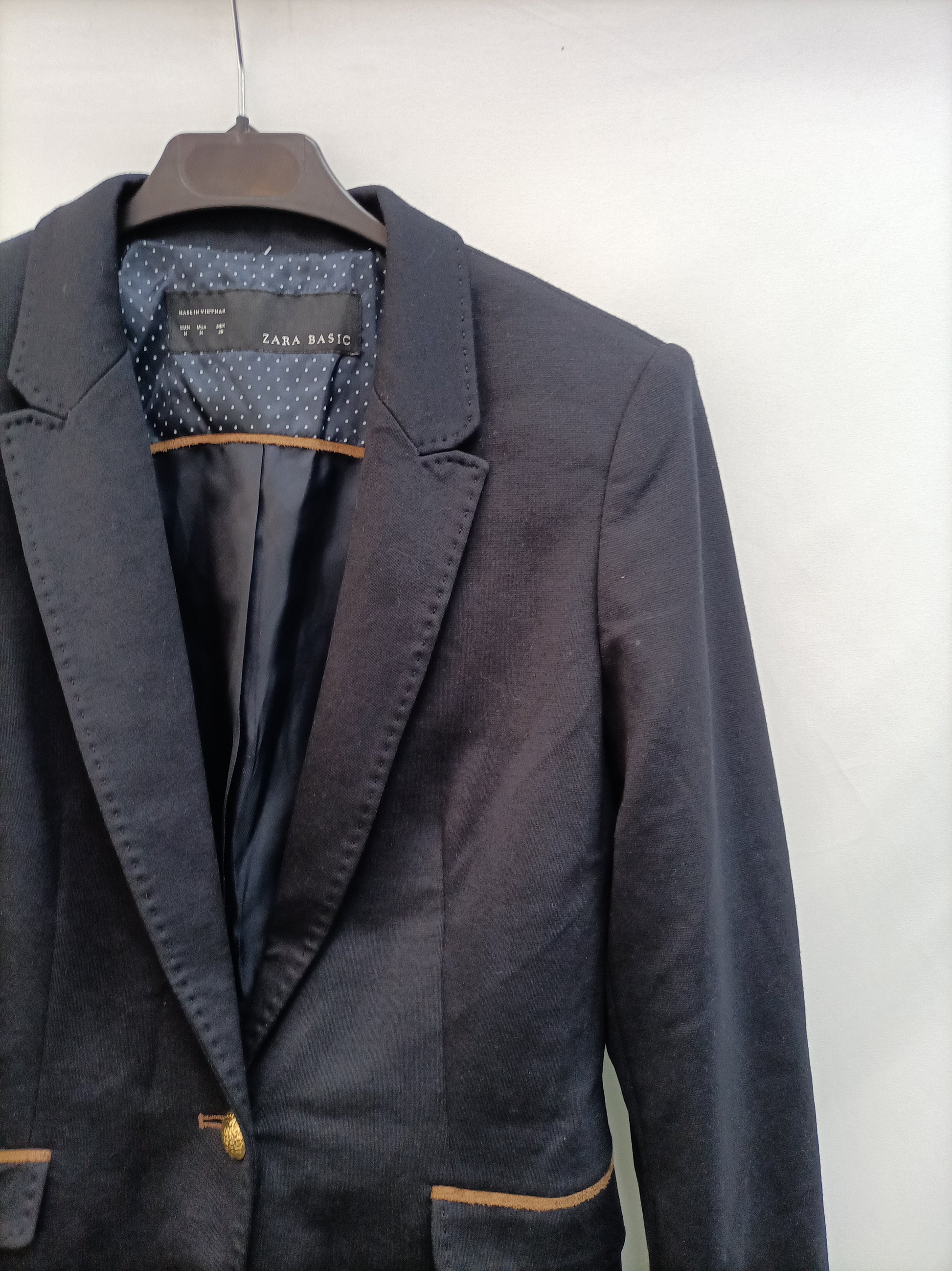 Blazer azul de punto con coderas y detalles en camel. No es elástica. Largo 68 cm