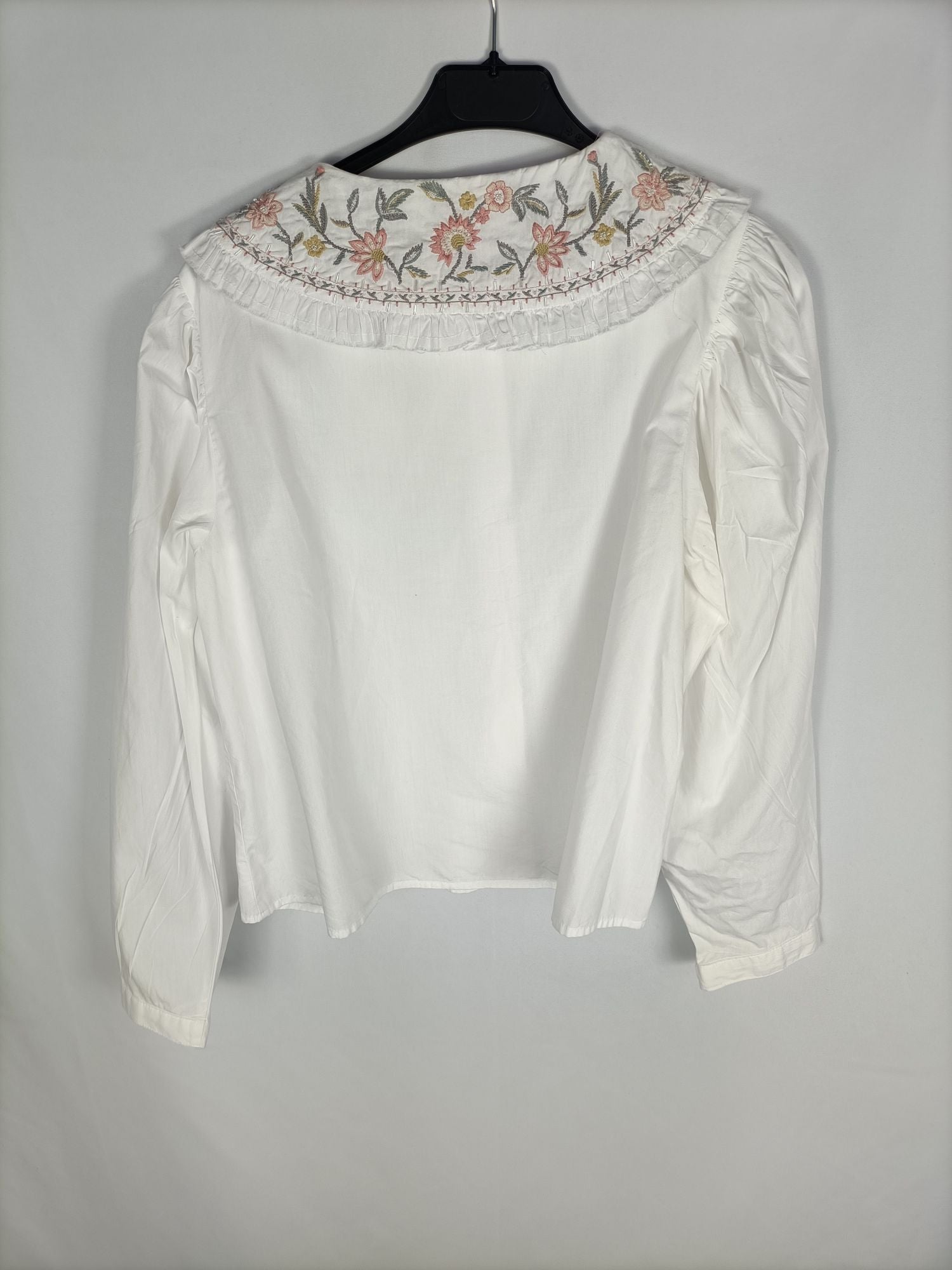 Zara.m. blusa blanca con el cuello bebé bordados y con abalorios. Manga abullonadas. No elástica. De sisa a sisa 49 cm largo 55 cm