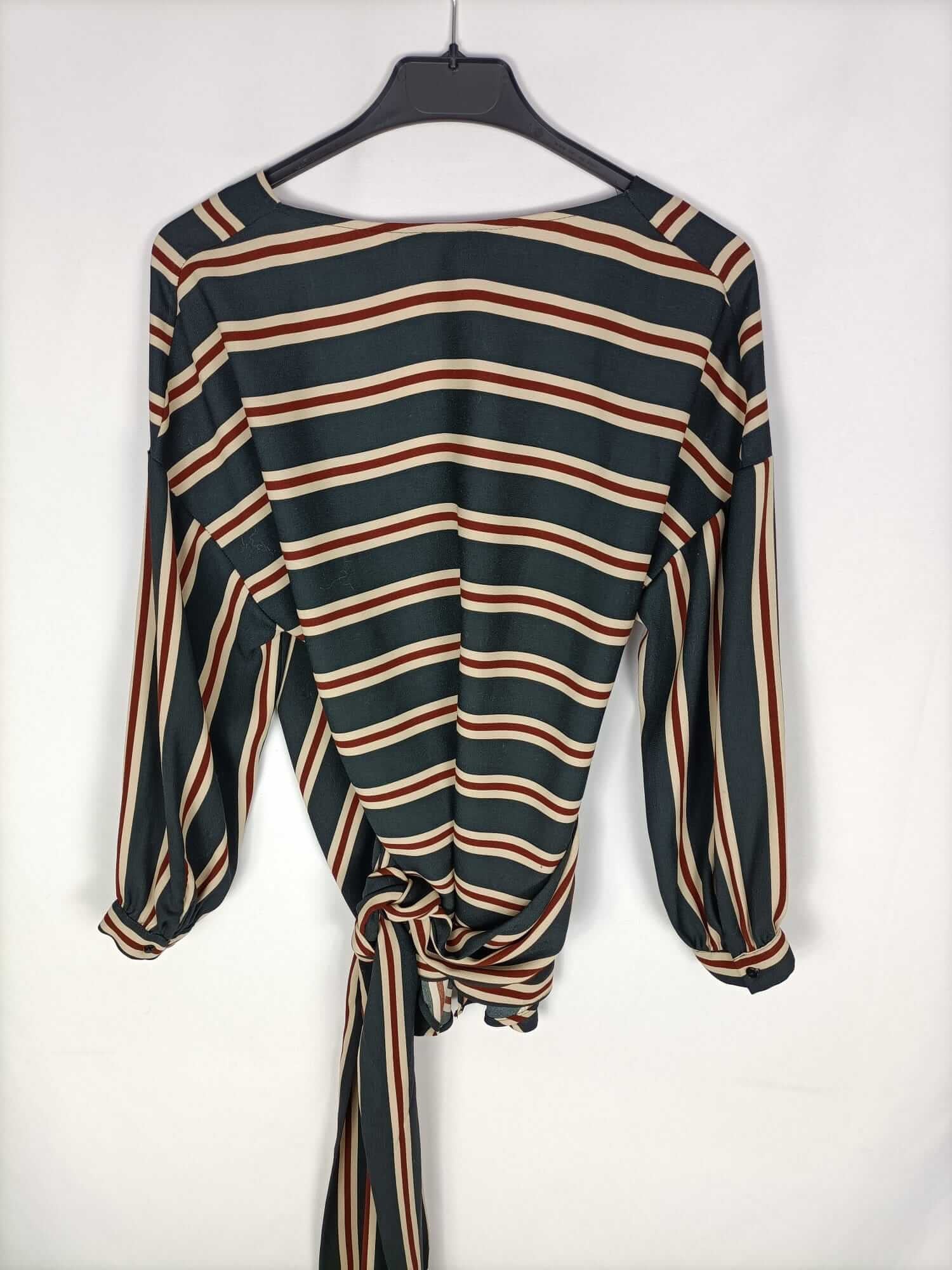 Zara. Blusa negra cruzada con rayas en tono beige y burdeos. Lazada por la espalda. No elástica. De sisa a sisa 51 cm largo 62 cm