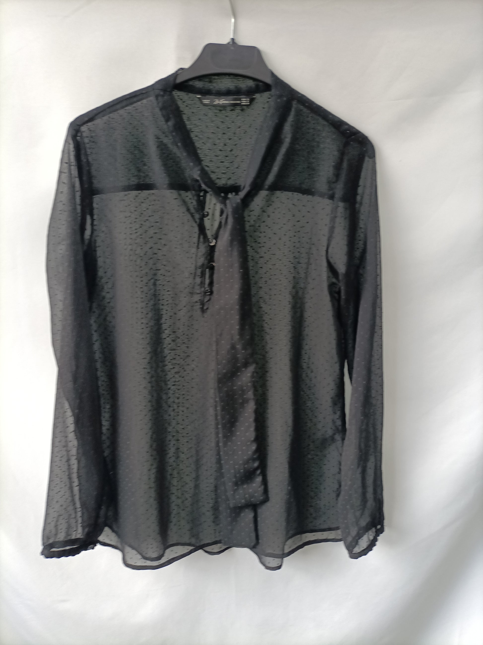 Zara. Blusa negra de plumeti con lazada en cuello. Semitransparente. No elástica. De sisa a sisa 52 cm largo 75 cm