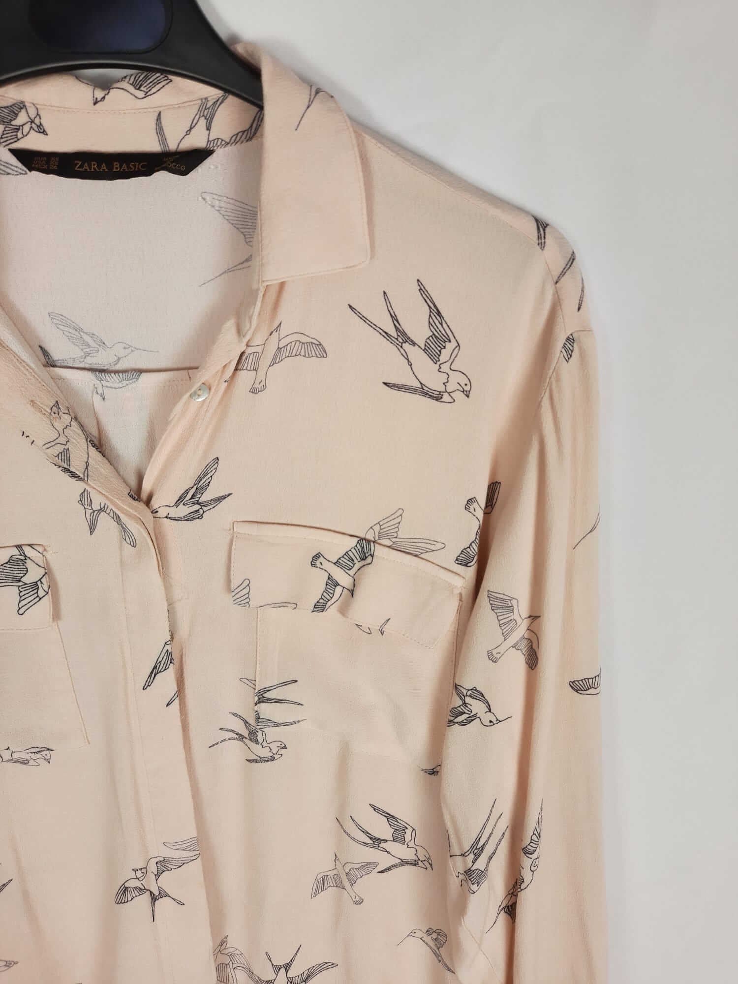 Zara. Blusa rosa palo fluida y fina con pájaros en tono azul. No elástica. De sisa a sisa 52 cm largo 70 cm