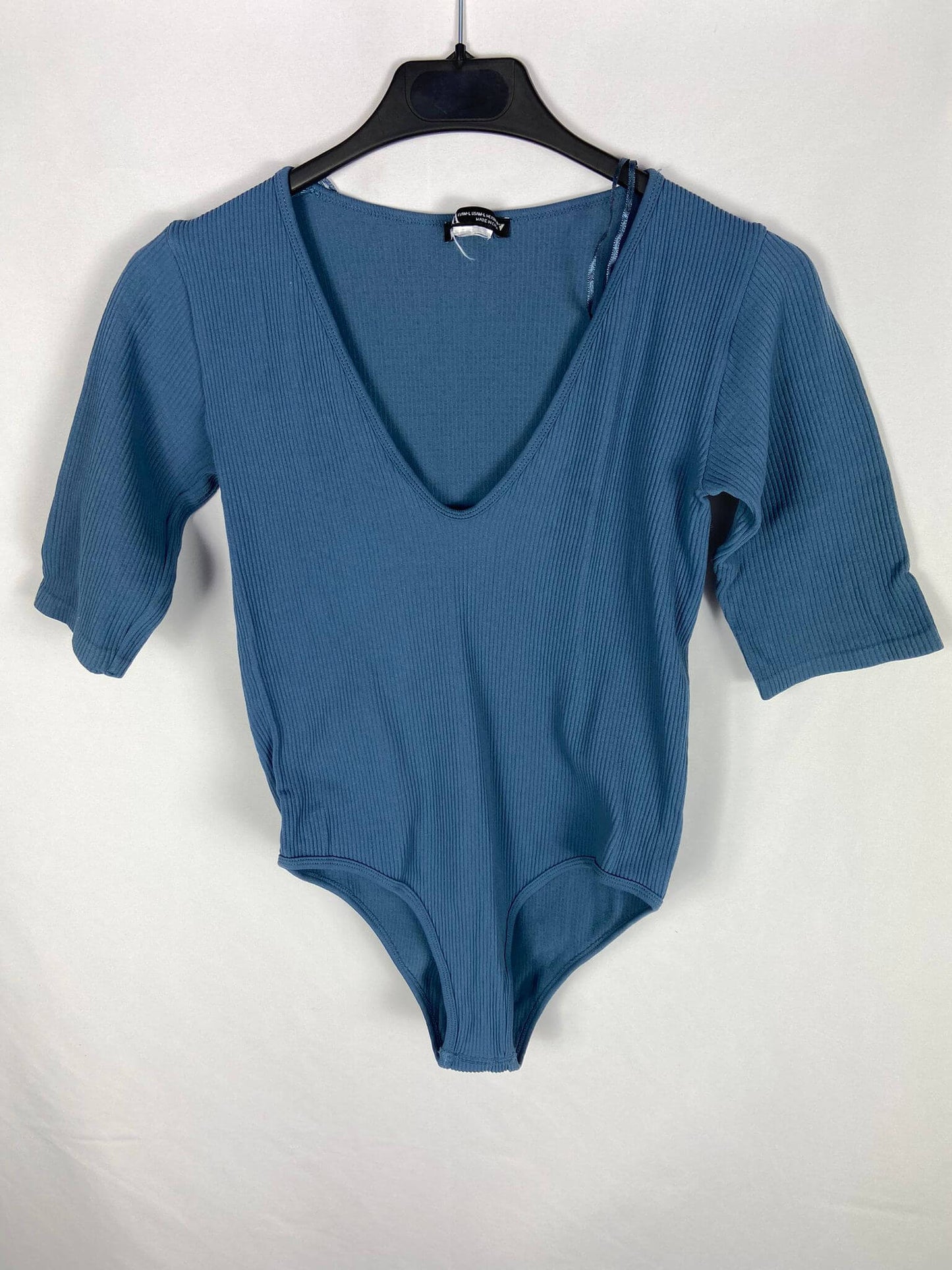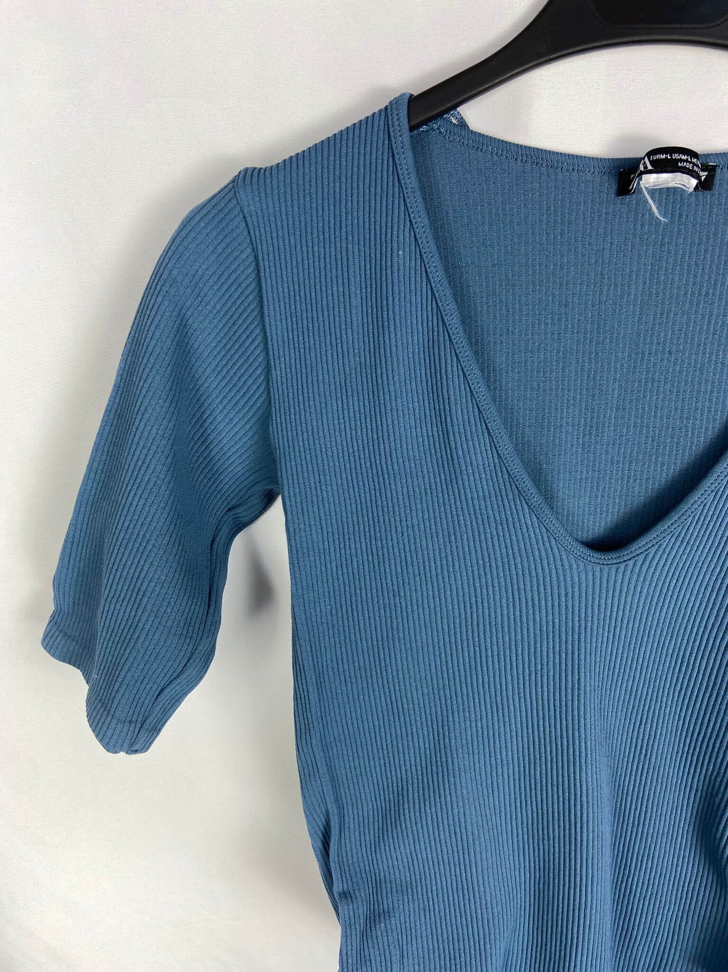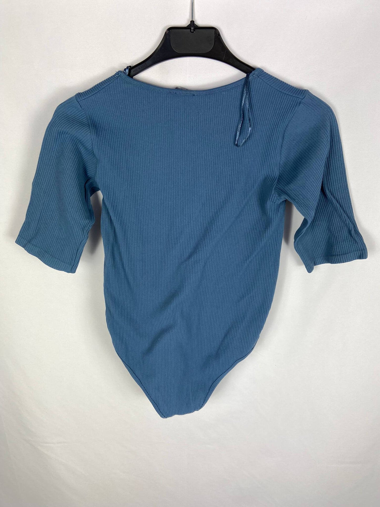 ZARA L. Body azul elástico canalé. Manga corta. Largo 60 cm