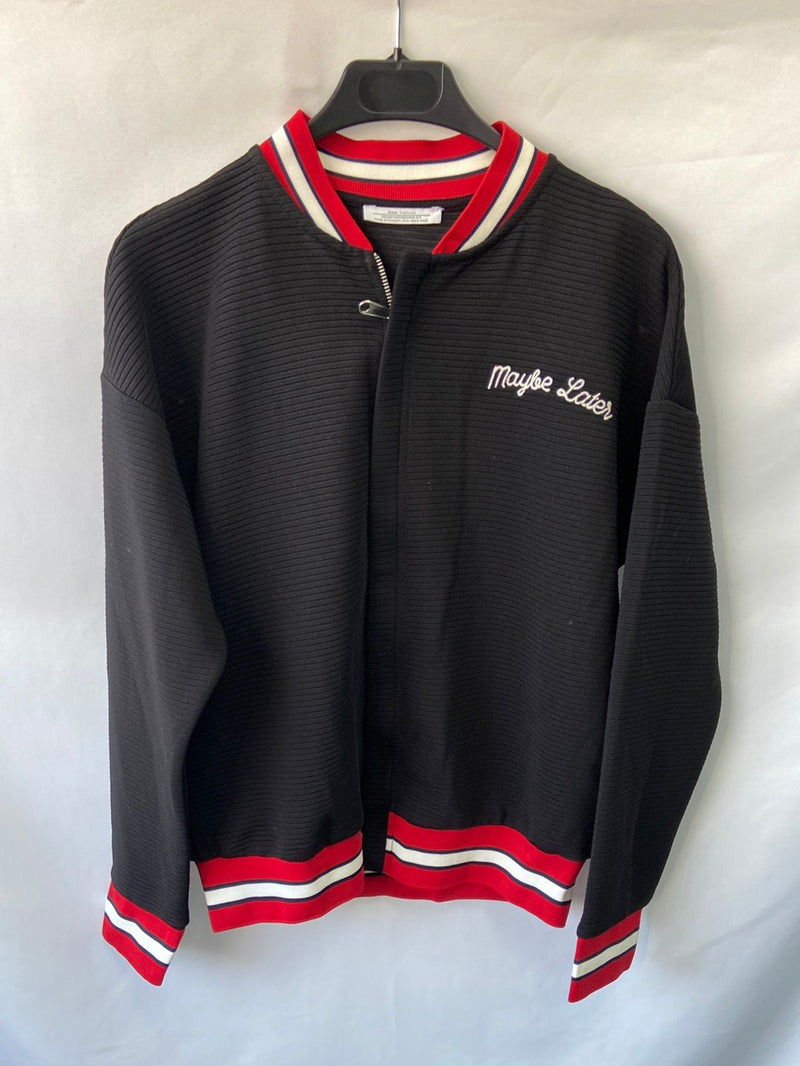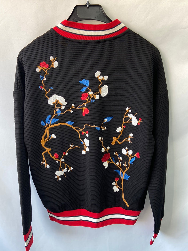 Bomber negra de tejido de canalé elástica con flores bordadas en la espalda. Largo 64 cm