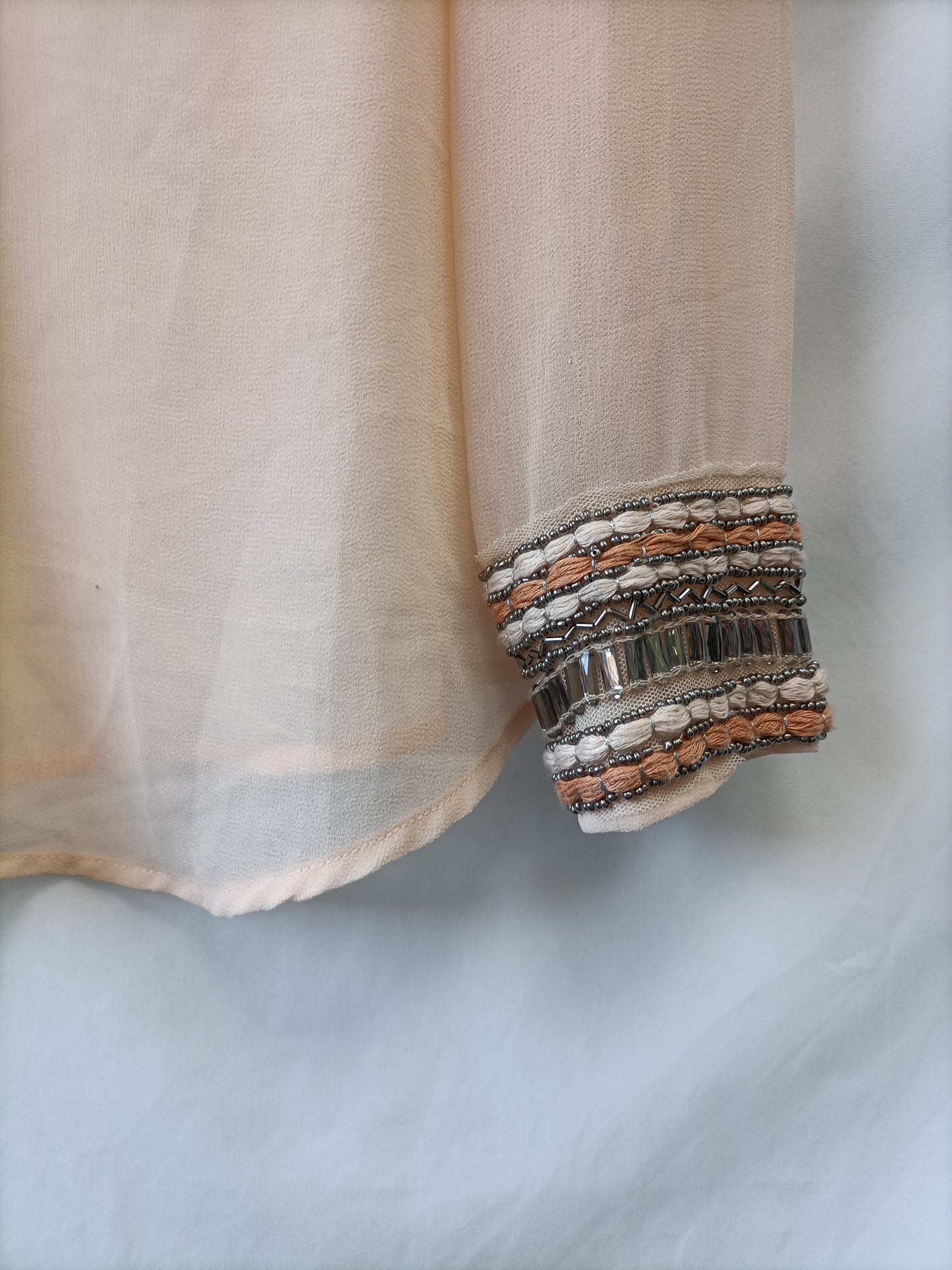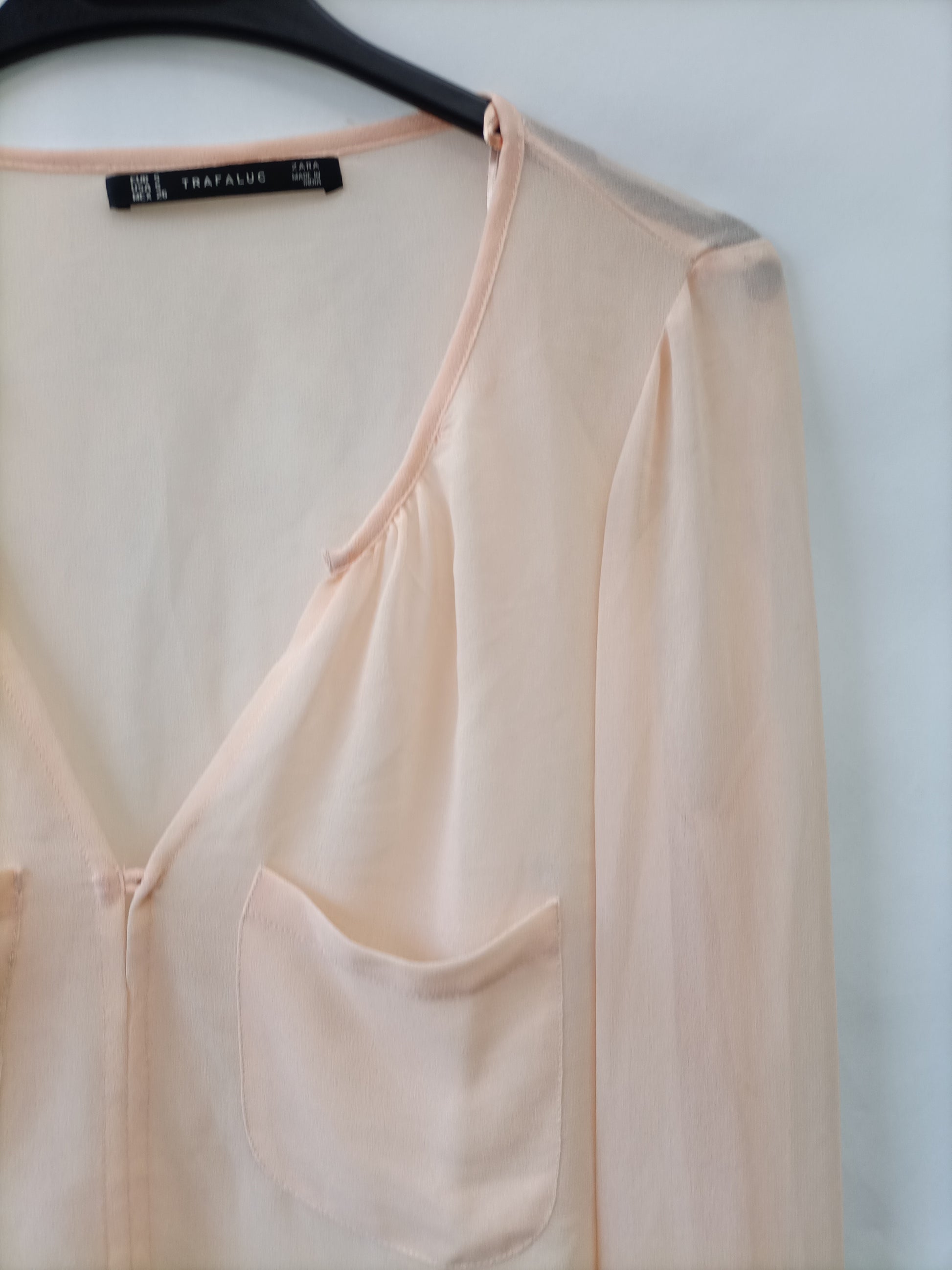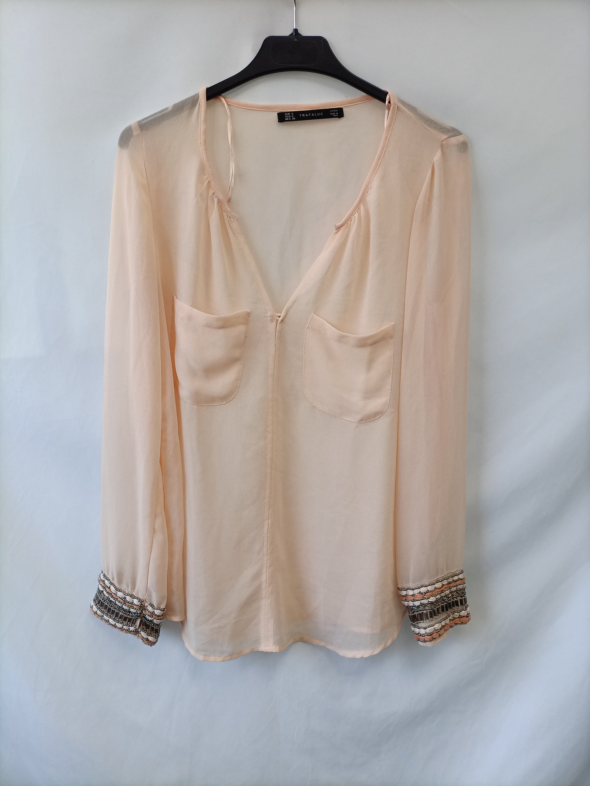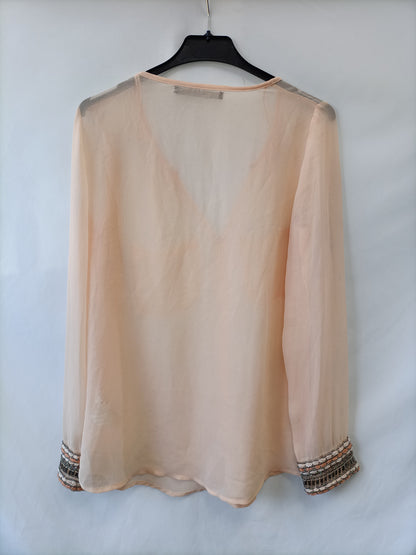 Blusa rosa palo con pedrería en las muñecas. Semitransparente. Largo 65 cm