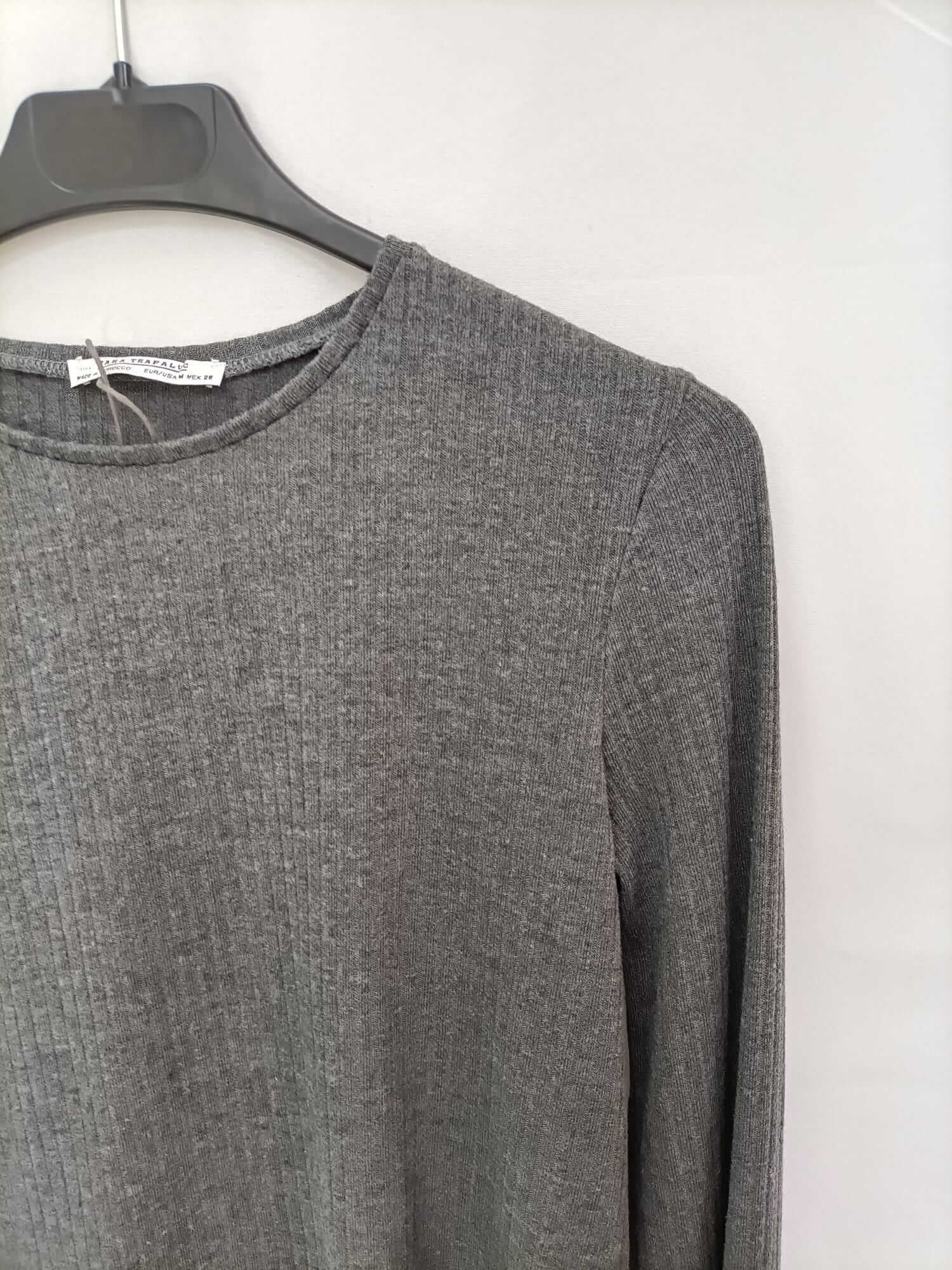 Zara. M. Camiseta gris de canalé elástico con las mangas con volante. Largo 60 cm