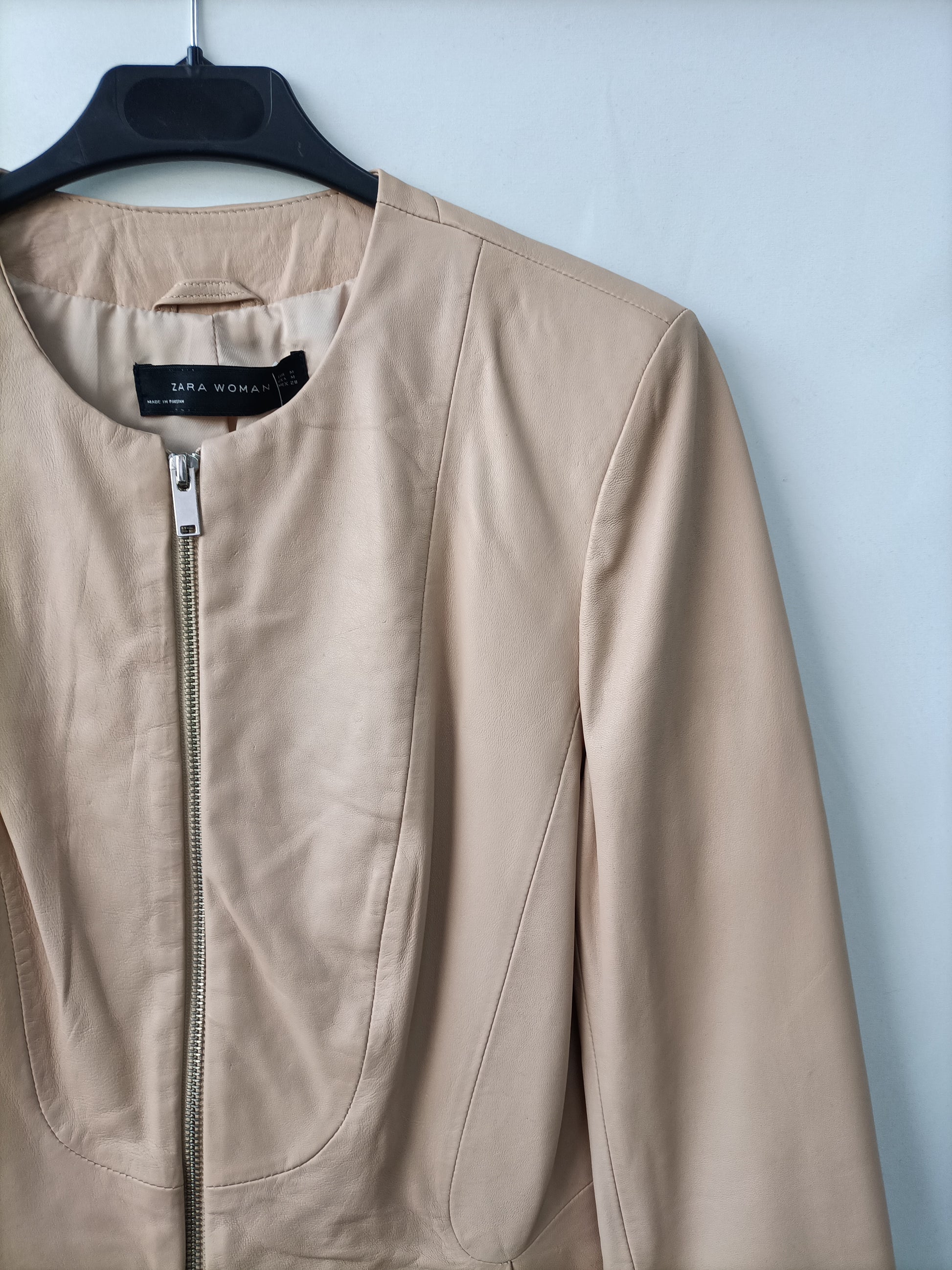 Zara. Cazadora de piel beige entallada con pinzas delanteras. No elástica. De sisa a sisa 44 cm largo 60 cm. Tara: alguna marquita en la piel