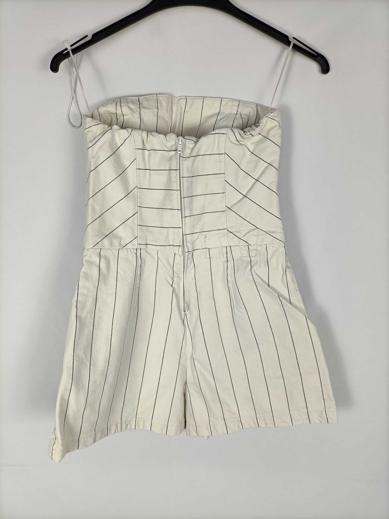 Zara. Xs. Mono corto beige con rayas azules de tejido denim. No elástico y palabra de honor. Elástico en la espalda. Pecho 34 cm largo 56 cm