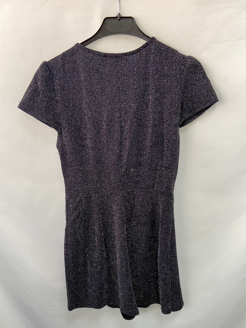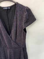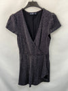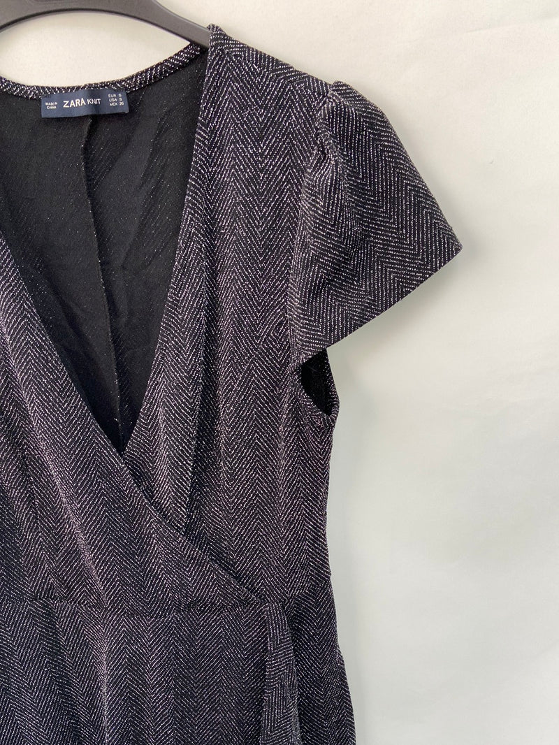 Mono negros con hilos plateados, escote cruzado, es elástico. Largo 73 cm.