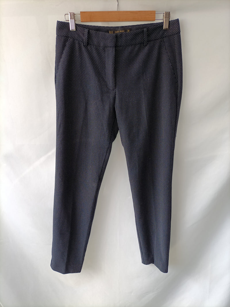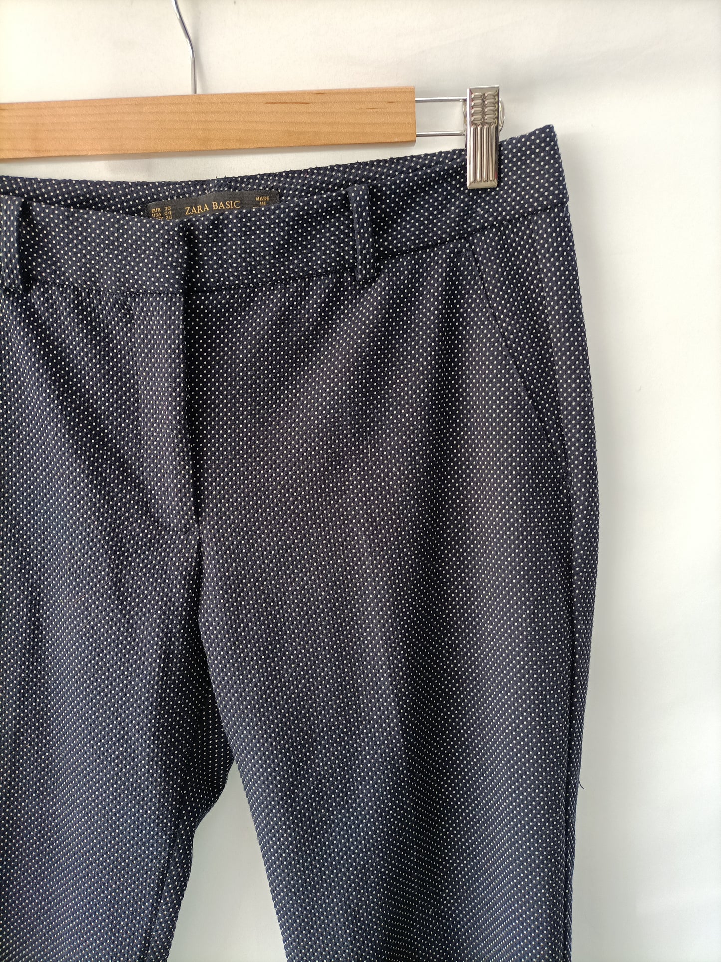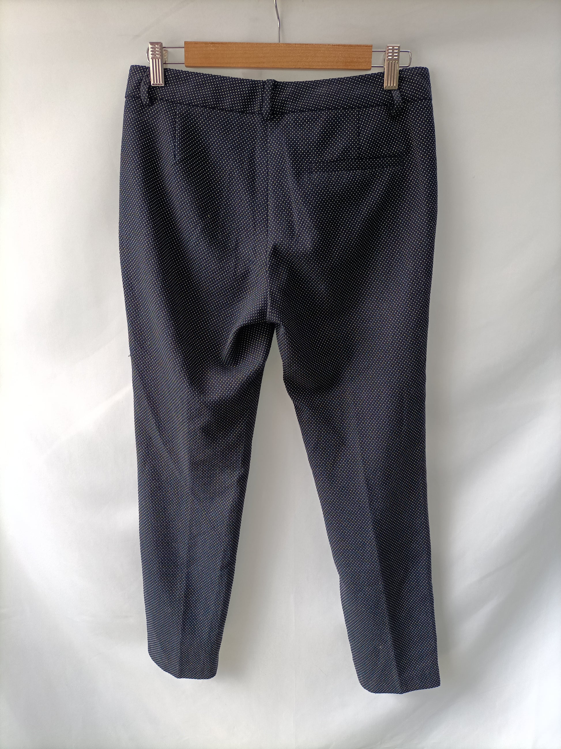 Pantalón azul de vestir con topitos blancos, tejido rugoso. No elástico. Cintura 36-38 cm largo 87 cm