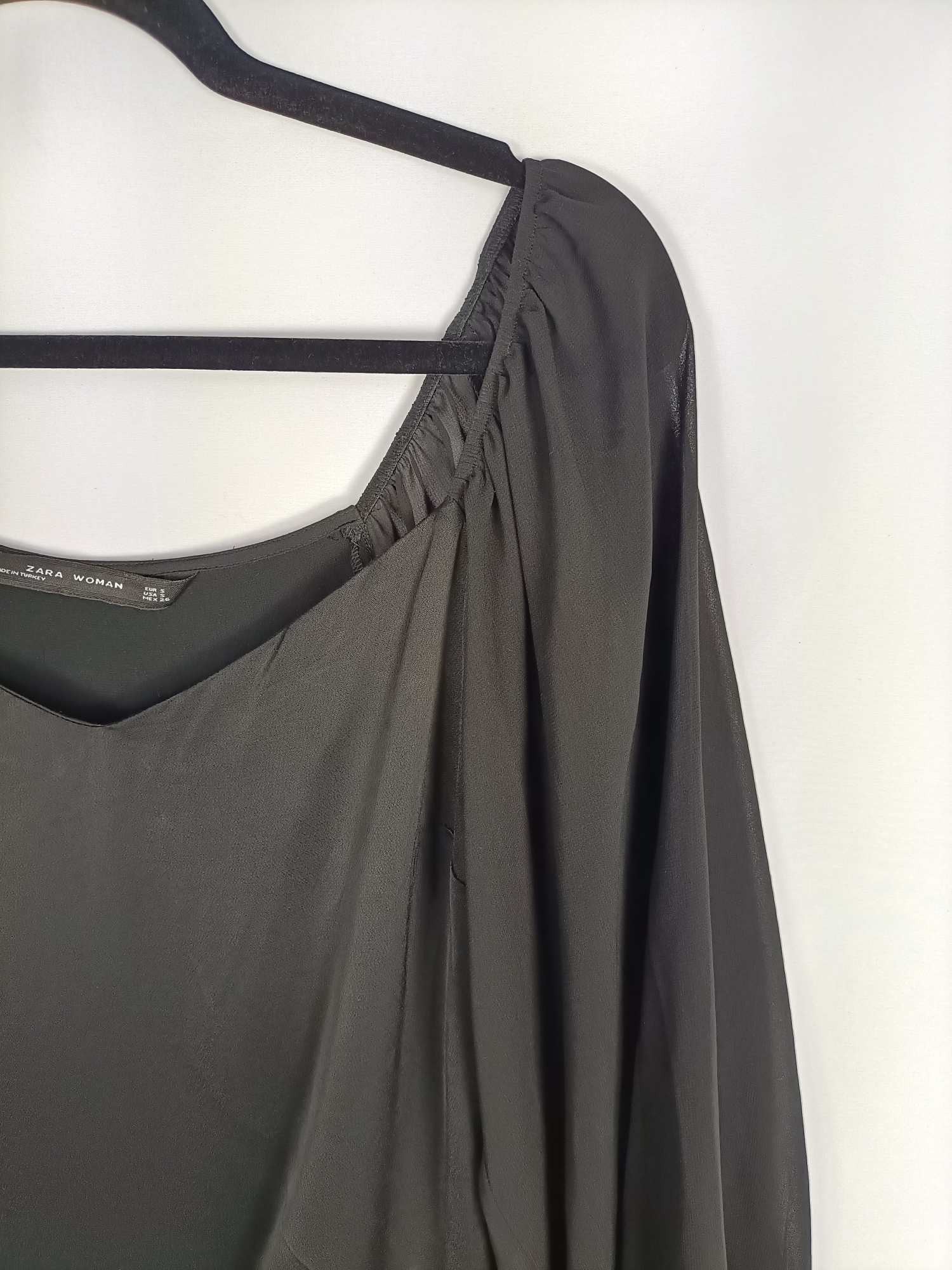 Zara. S. Top negro doble textura cuerpo satinado y mangas semitransparentes abullonadas. No elástico. De sisa a sisa 38 cm largo 54 cm