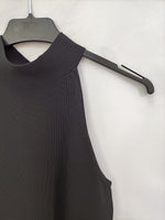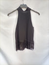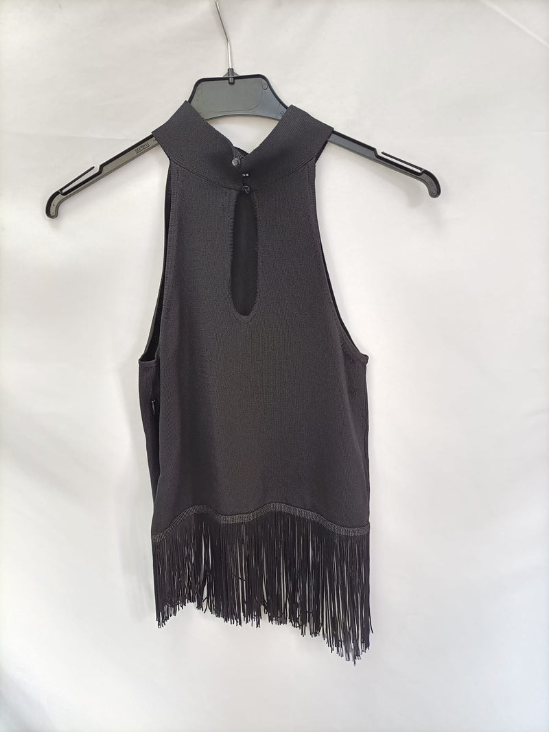 Top negro ajustado de canalé con el escote halter y cuello Perkins. Flecos. Elástico. Largo 42 cm