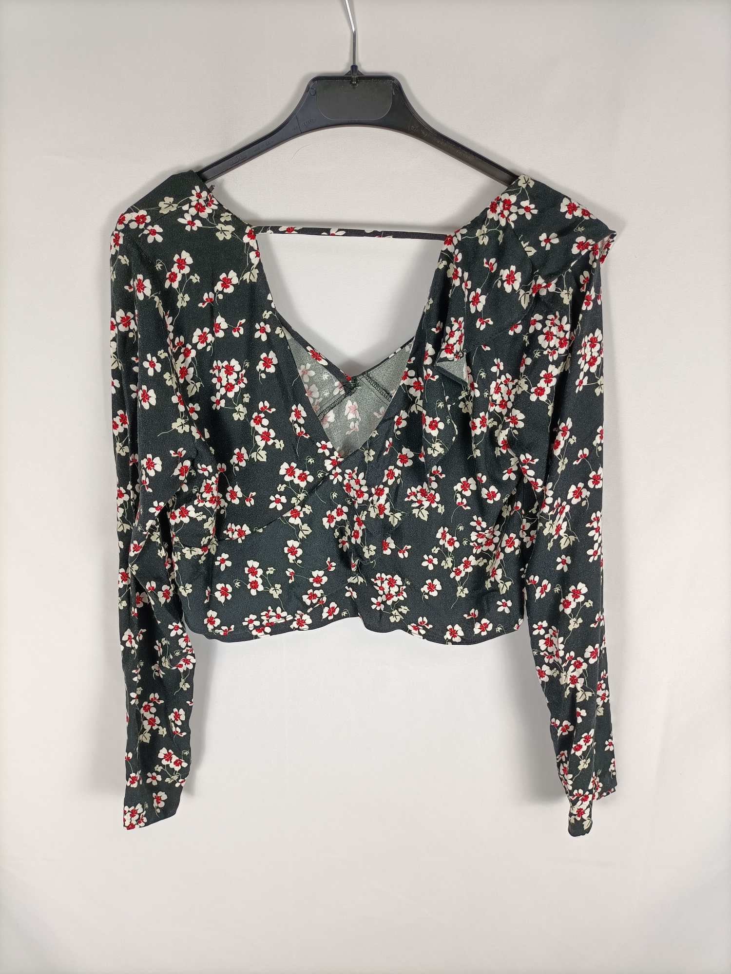 Zara. S. Top negro con flores en tono blanco y rojo. Detalle de volantes en la parte delantera y trasera. Espalda al aire. No elastico. De sisa a sisa 43 cm largo 44 cm