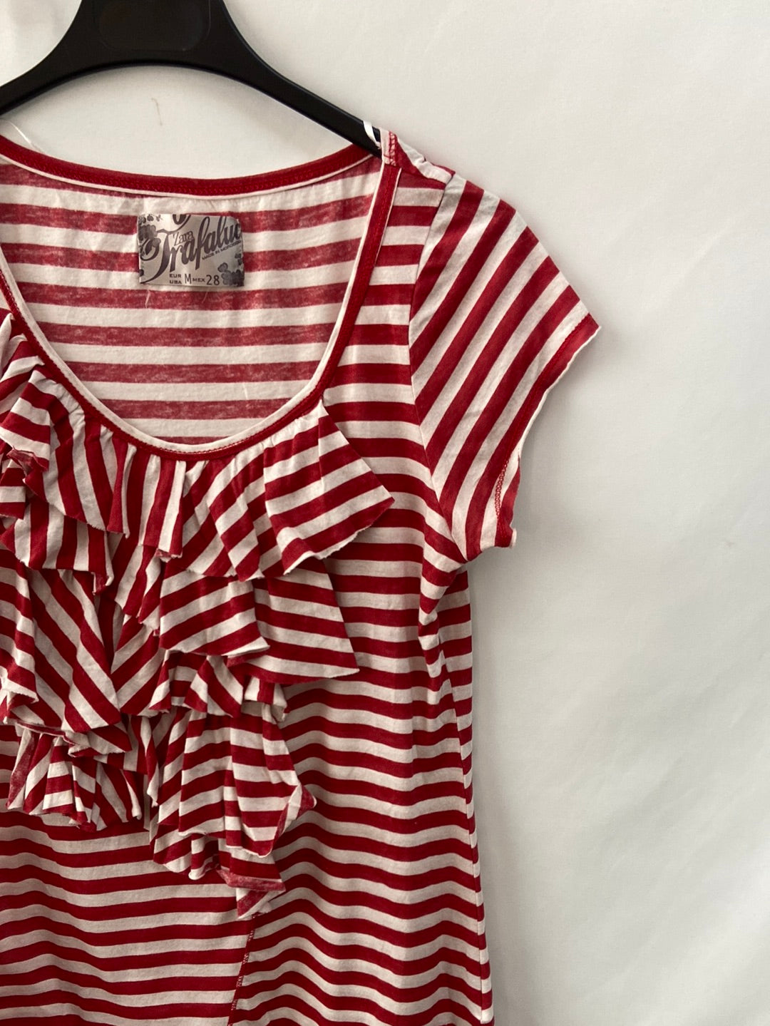 Camiseta de rayas blanca y roja con volantes delanteros. Largo 72 cm