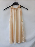 Top beige tipo seda con sisa amplia detalle de cadena en el cuello y fruncidito. Largo 67 cm