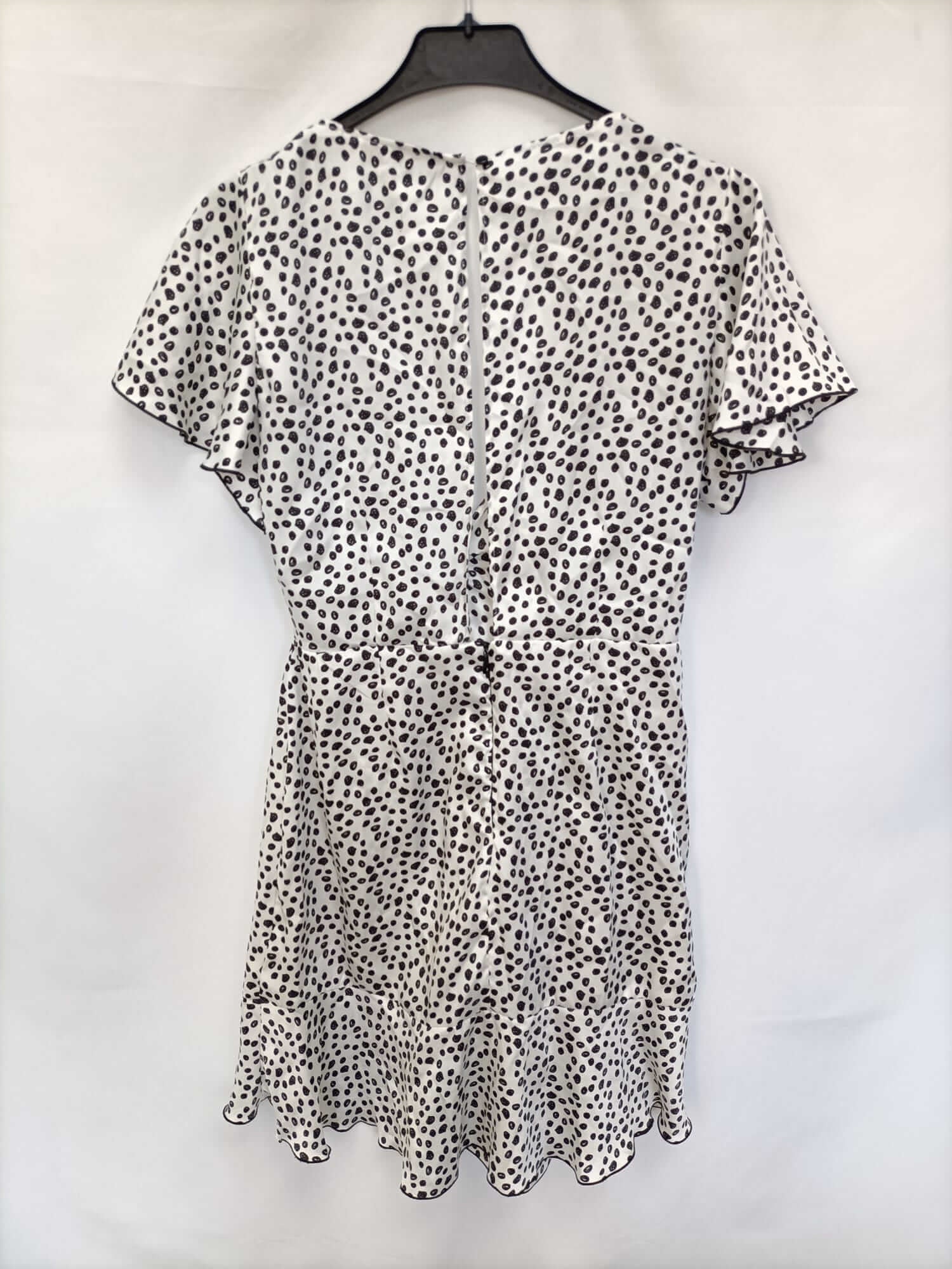 Zara. M. Vestido corto blanco con topitos negro cruzado y fruncido por delante y espalda baja. De sisa a sisa 50 cm largo 84 cm