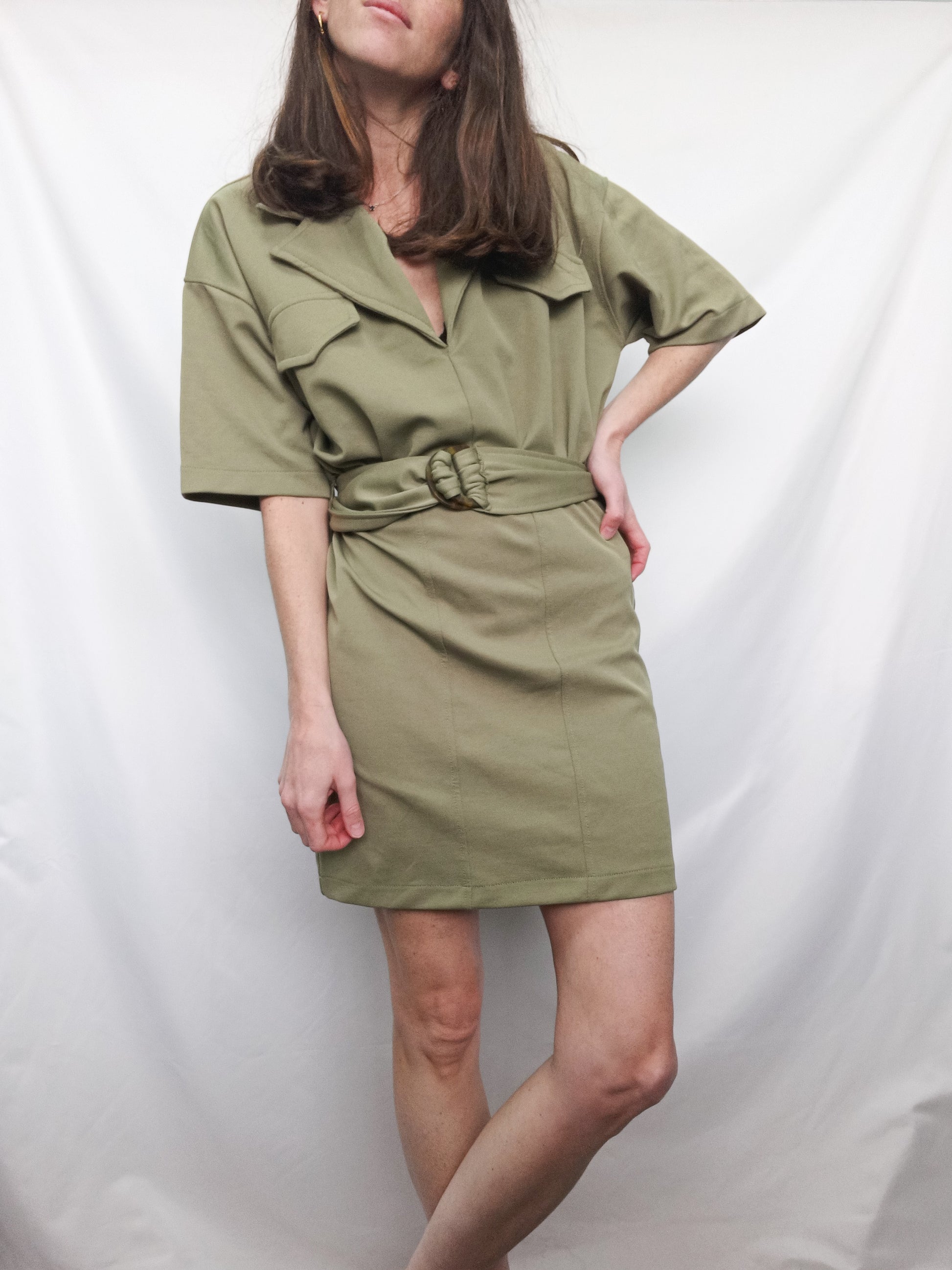 Zara. L. Vestido corto verde caqui de tejido elástico. Corto. Largo 88 cm