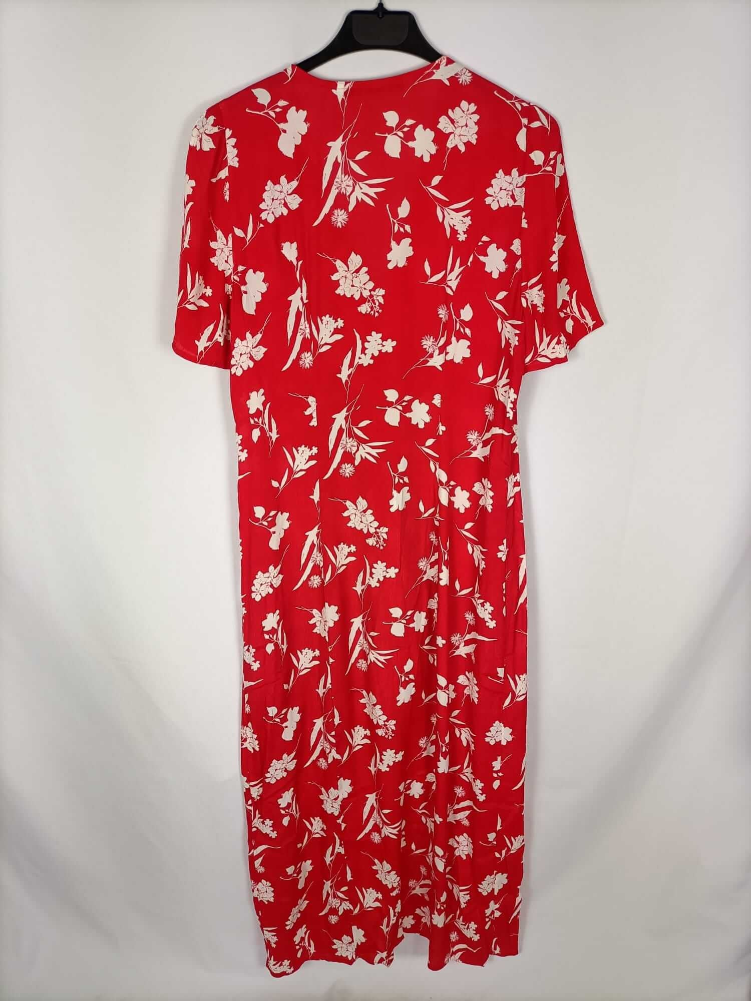 Zara.s. vestido largo rojo con flores blancas. Abotonado y con escote en pico. Fluido y fino. No elástico. De sisa a sisa 47 cm largo 132 cm