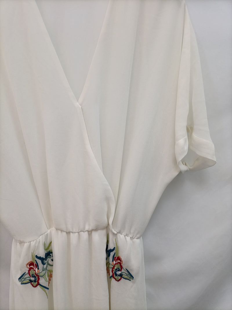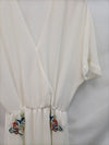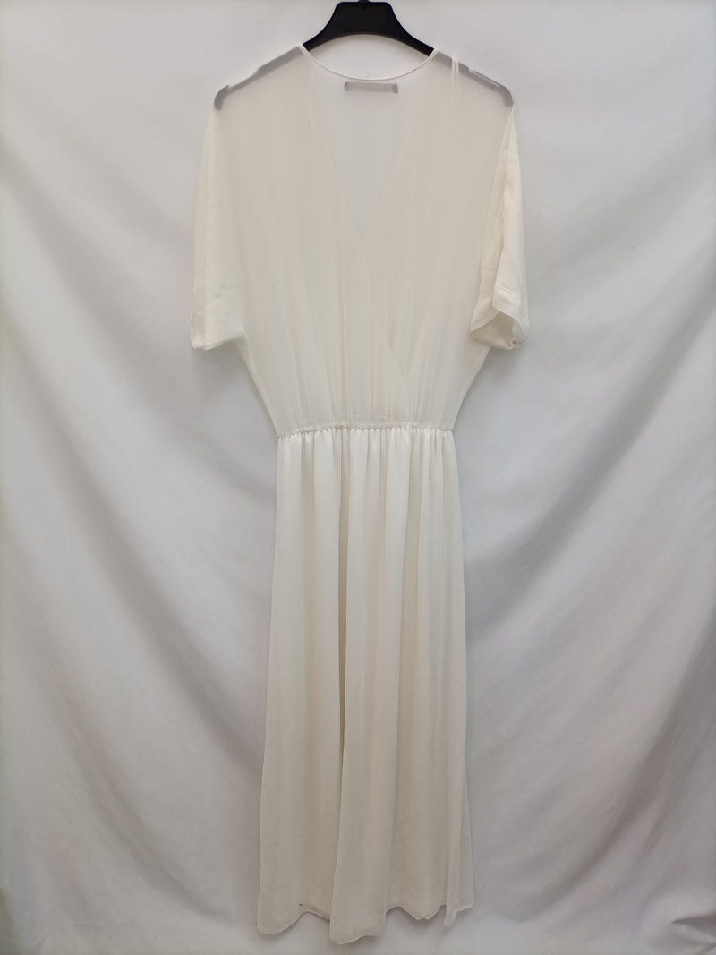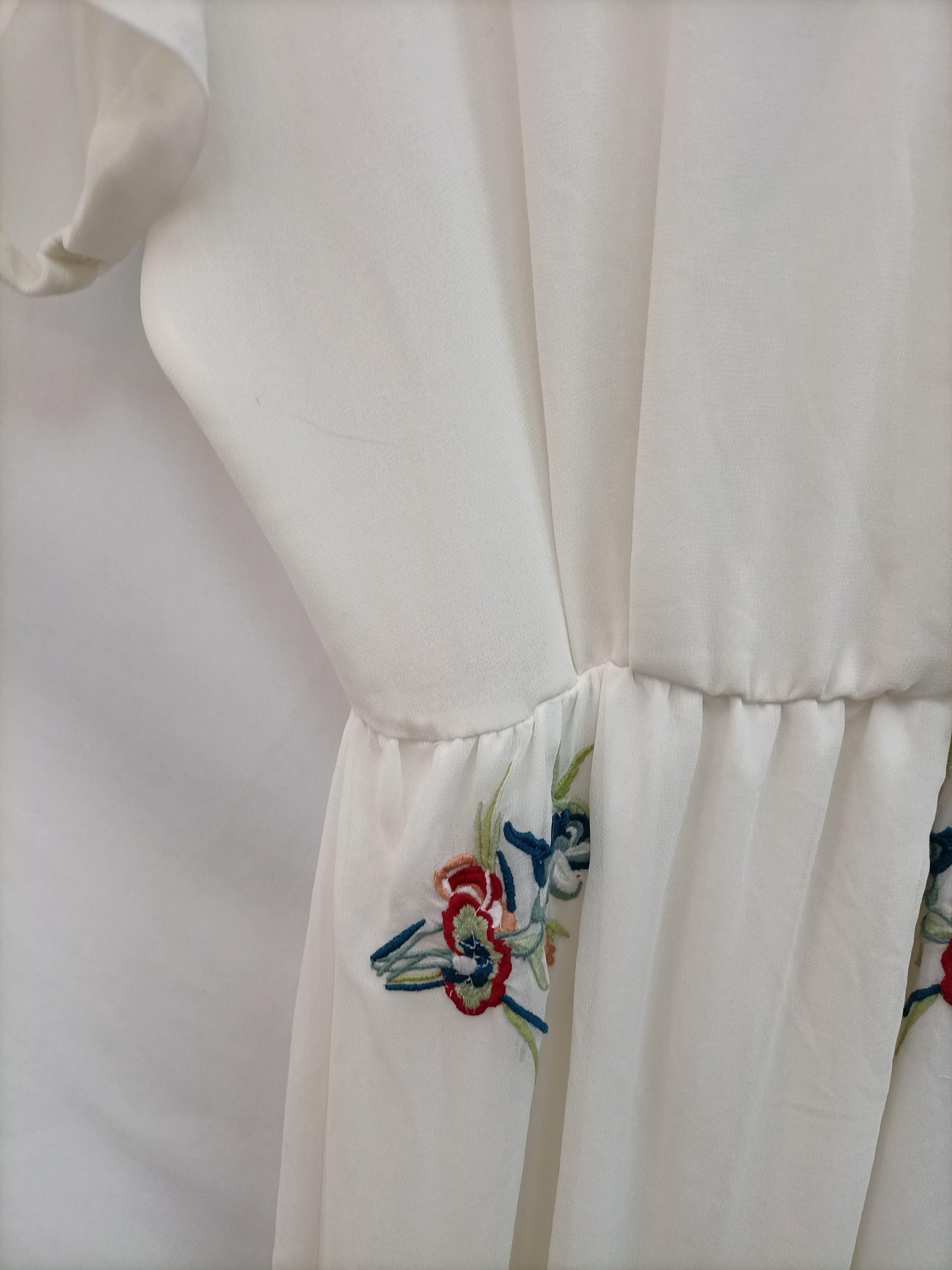 Vestido blanco largo con la parte de arriba semitransparente y forro en la parte de abajo con caída vaporosa. Cintura elástica con detalles de flores. Largo 150 cm
