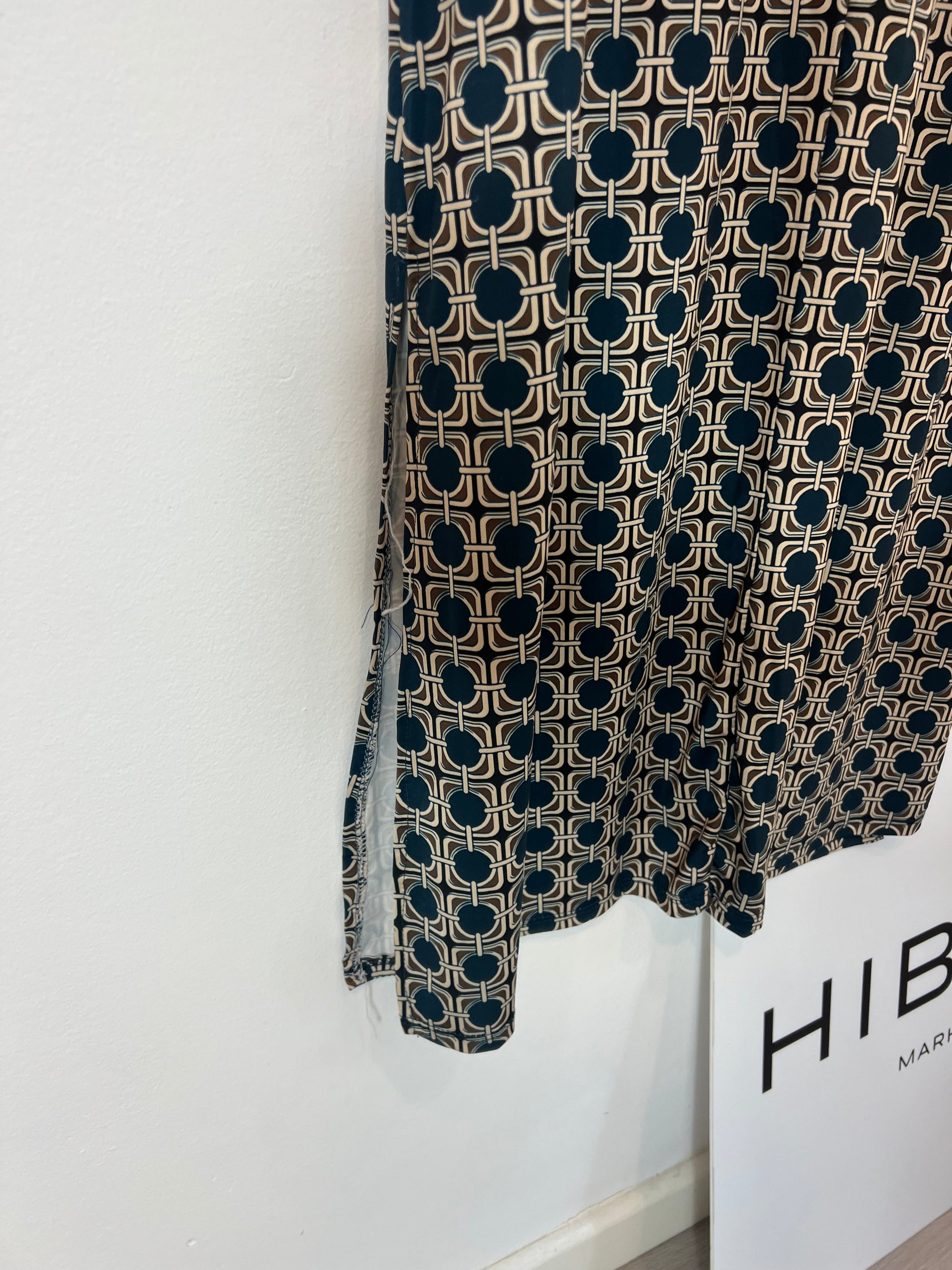 vestido largo estampado azul y beige tejido elástico y pliegue delantero
