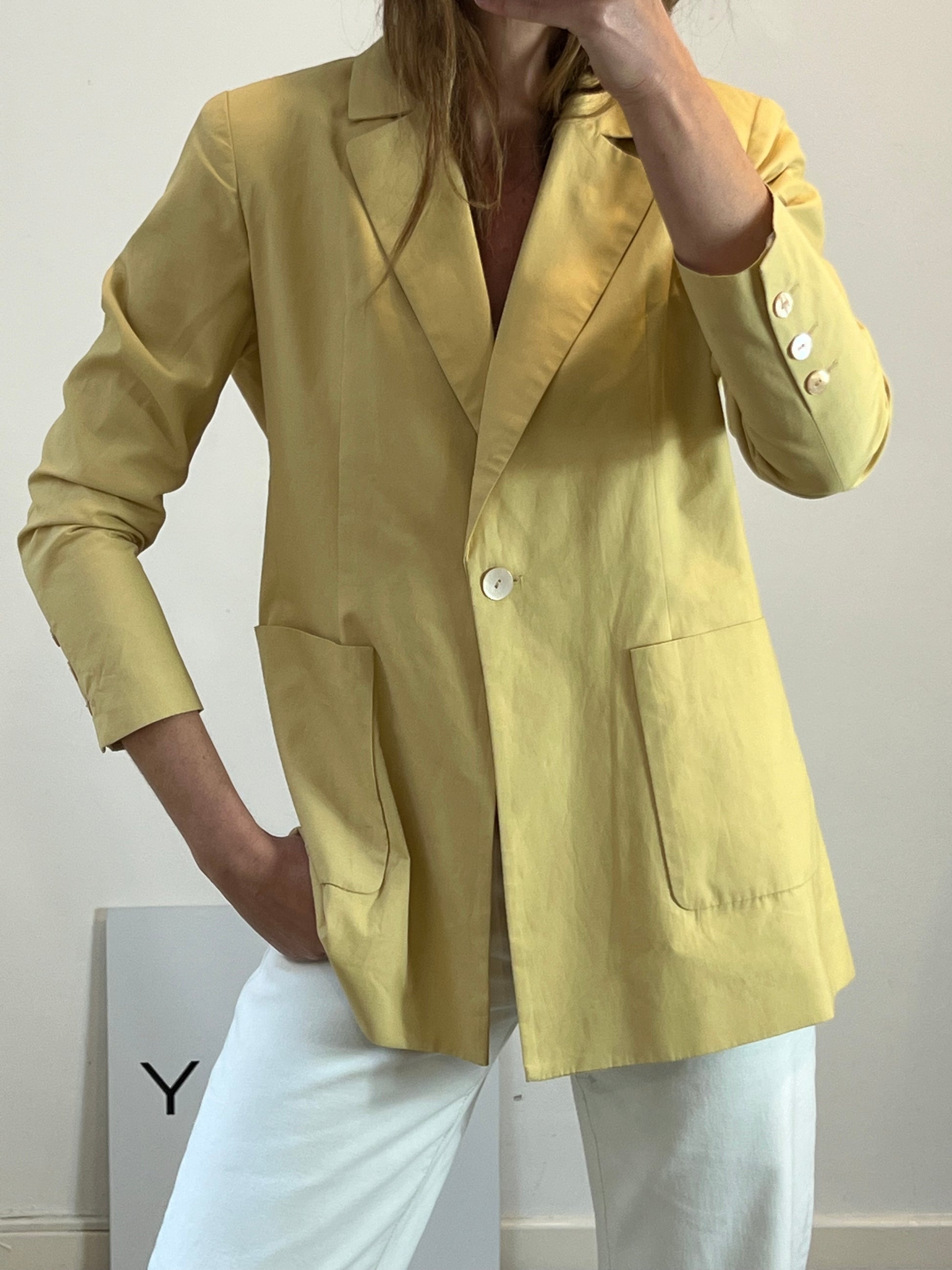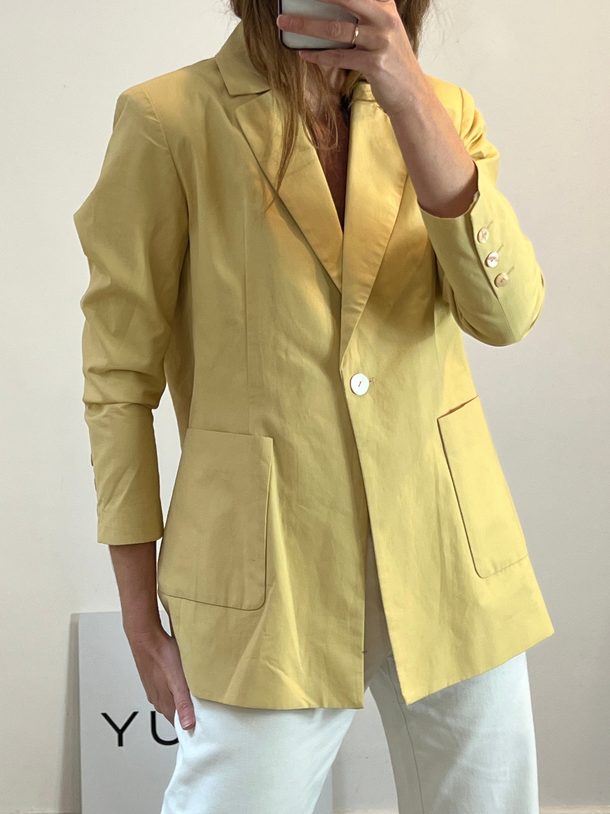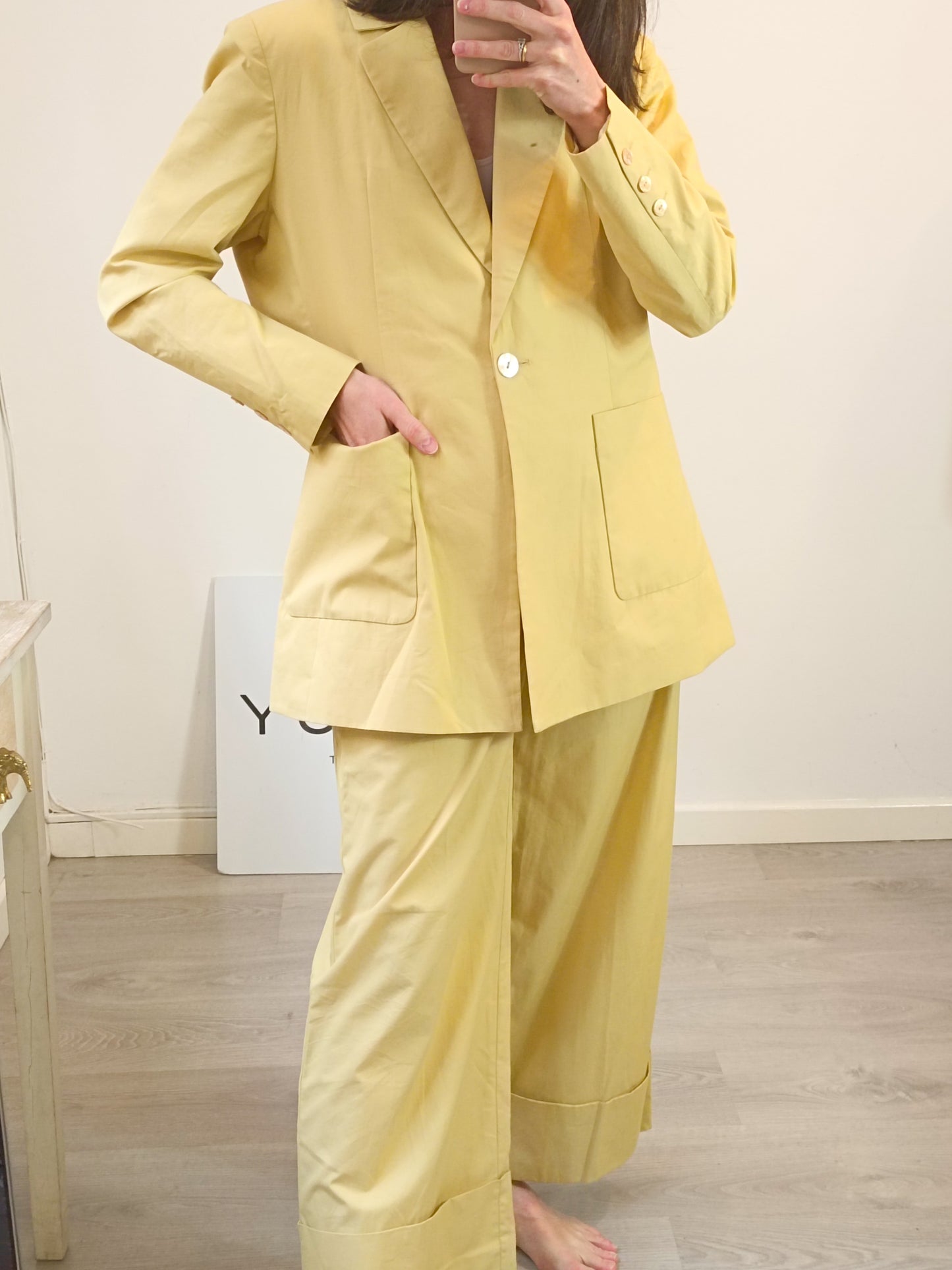 Blazer M: Hombros 40 cm con hombreras finas, Espalda 56 cm, largo 75 cm. Pantalón S : cintura 36 cm, largo 100 cm. No elástico. Tara: mini manchas mañana poco visibles (foto)